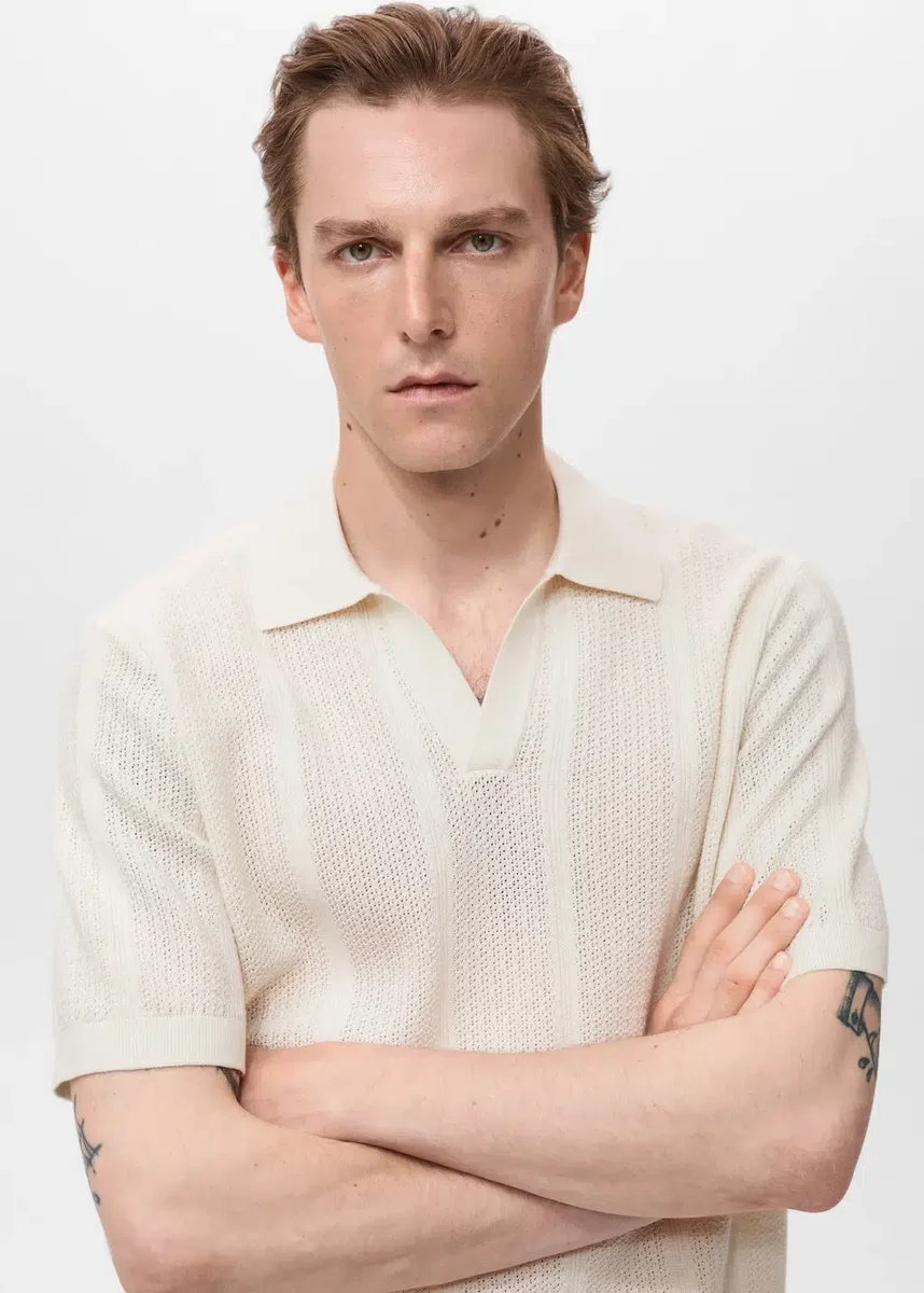 Rovný střih. Bavlněná směsová tkanina. Průstřihový úplet. Pruhovaný design. Polo tričko s límečkem bez knoflíků. Krátký rukáv. Žebrovaný límeček, rukávy a lem. Černý pátek