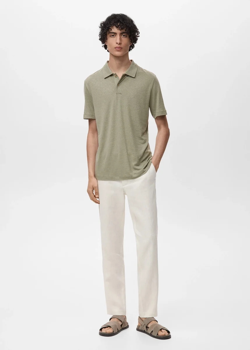 Štíhlý střih. Směsová látka s obsahem lnu. Polo límec se zapínáním na knoflíky. Krátký rukáv. Malé boční rozparky na lemu. Rovný lem. Slim fit. Propagační produkt