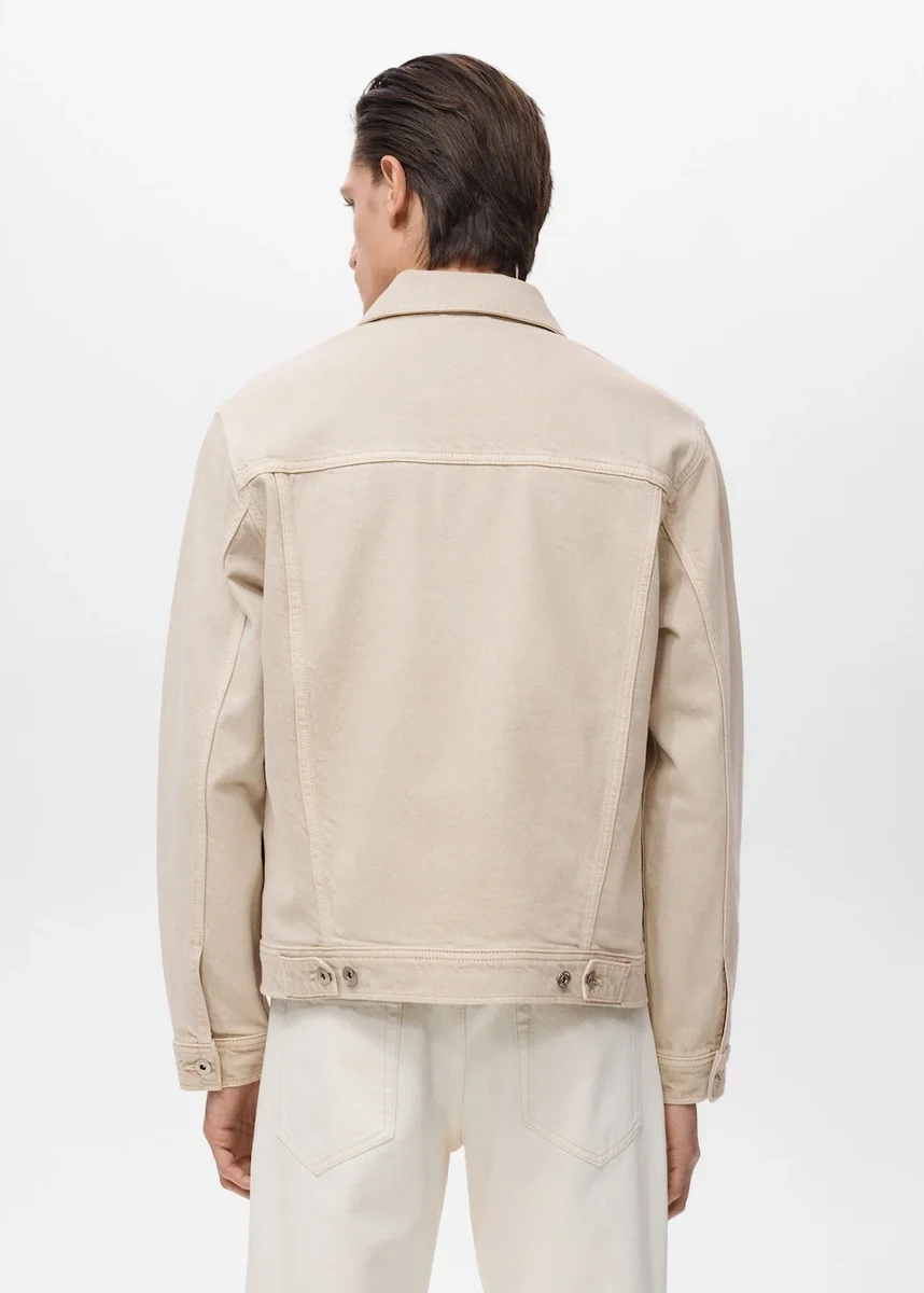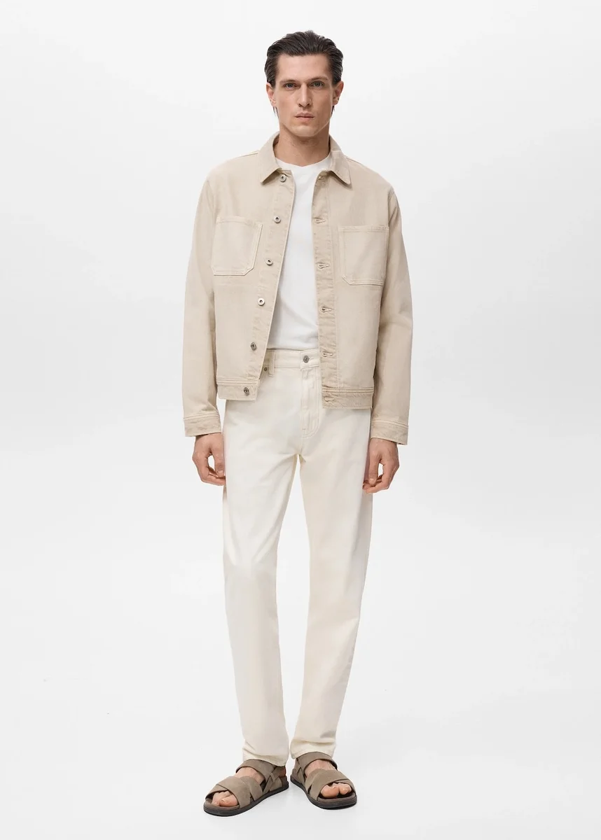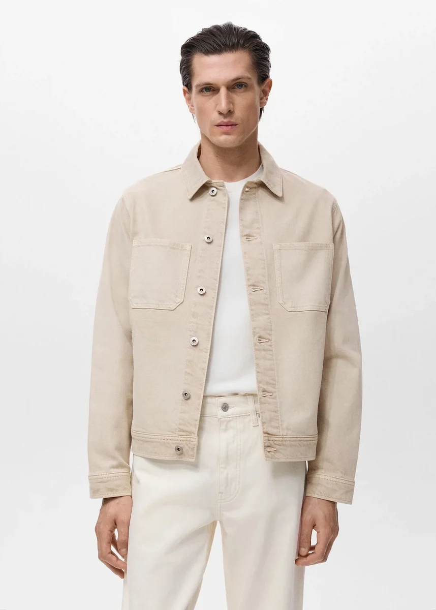 Úzký střih. Bavlněná tkanina. Detaily se zadním prošíváním. Košilový límec. Dvě našité kapsy na hrudi. Dvě boční kapsy s lemováním. Dlouhé rukávy s manžetami na knoflíky. Poutko s knoflíkem v pase. Zapínání na knoflíky vpředu