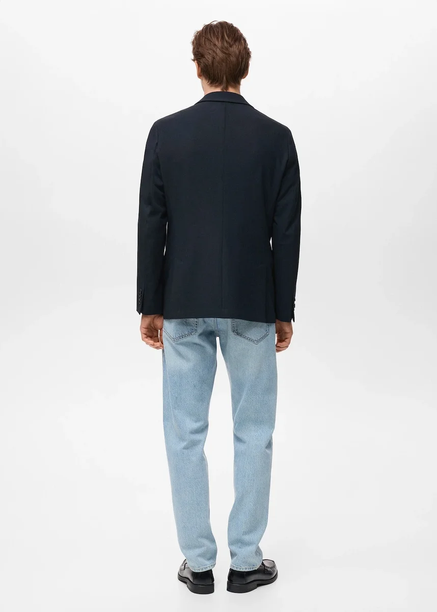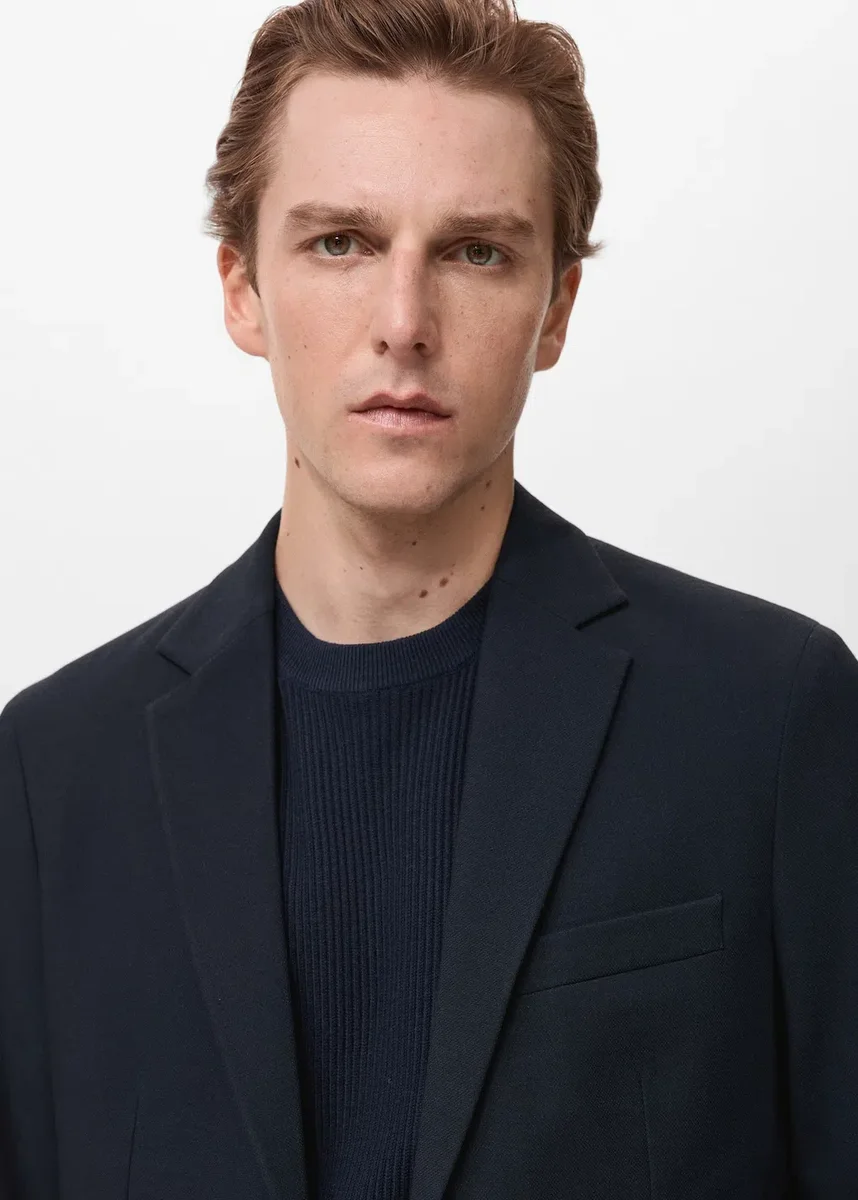 Kolekce na míru. Slim fit. Bavlněná směsová tkanina. Klopový límec. Zapínání na knoflíky vpředu. Náprsní kapsa. Dvě kapsy s klopami vpředu. Manžety s knoflíky. Dvě rozparky na zadním lemu. Vnitřní kapsa.