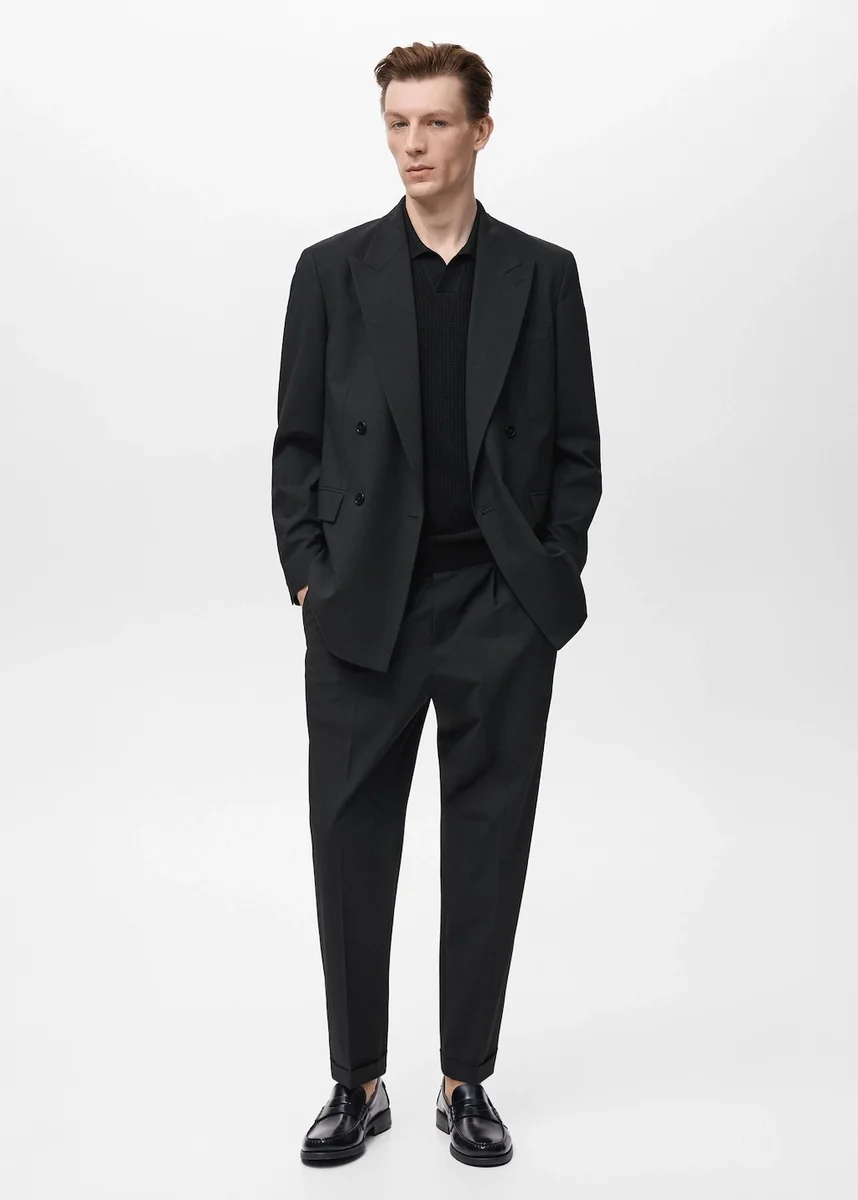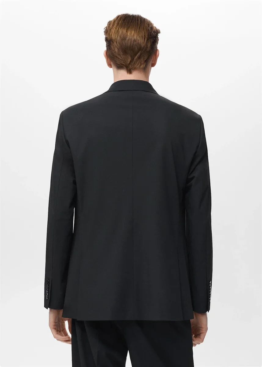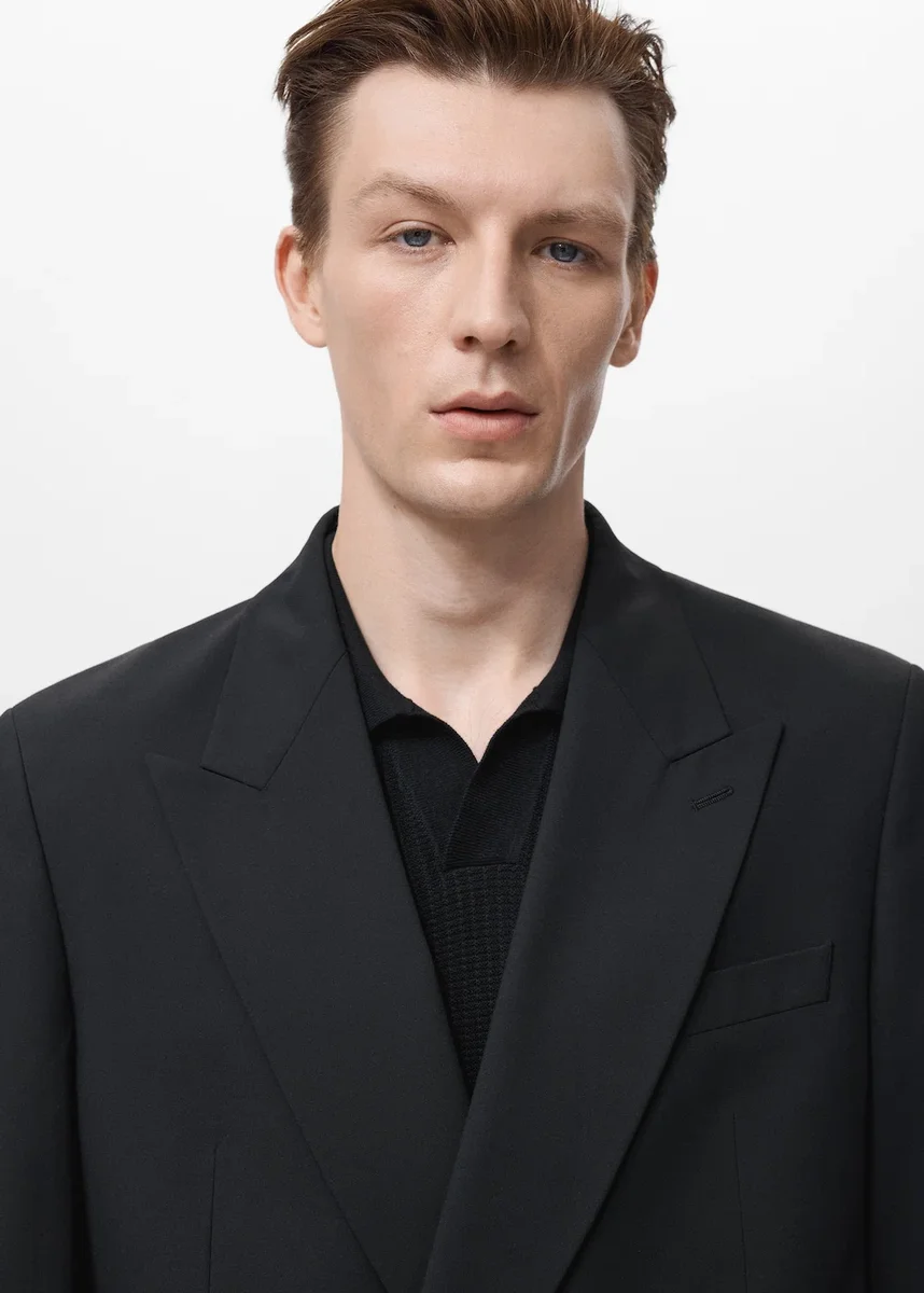 Kolekce na míru. Regular fit. Přezůvkový střih. Klopový límec a knoflíková dírka. Zapínání vpředu na křížené knoflíky. Náprsní kapsa s lemováním. Dvě kapsy s klopami vpředu. Dvojitý rozparek vzadu. Vnitřní podšívka. Vnitřní kapsa. Manžety s knoflíky.