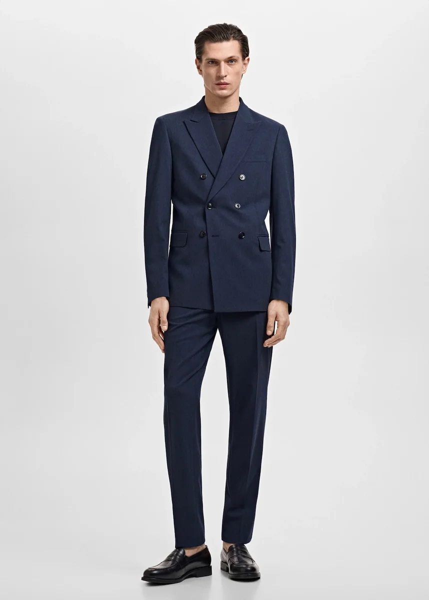 Slim fit. Kolekce na míru. Klopový límec a knoflíková dírka. Náprsní kapsa s lemováním. Design s dvouřadým zapínáním vpředu. Dvě boční kapsy s klopou a lemováním. Manžety s knoflíky. Boční rozparek v dolním lemu.