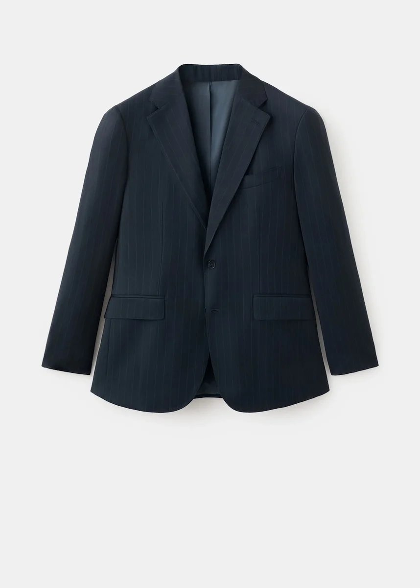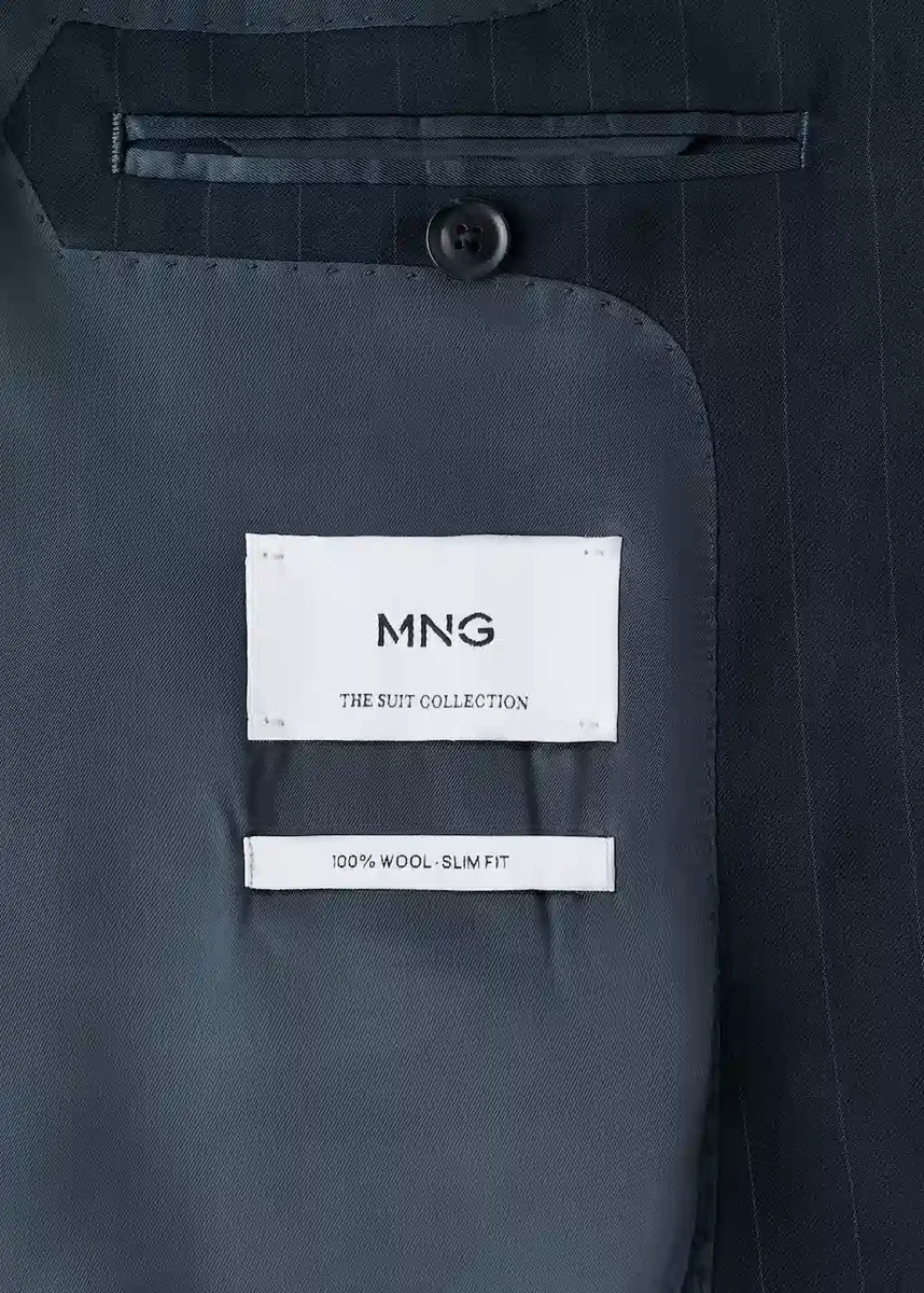 Úzký střih. 100% panenská vlna. Klopový límec. Náprsní kapsa. Dvě kapsy s klopami na přední straně. Vnitřní kapsa. Vnitřní podšívka. Dlouhé rukávy s manžetami na knoflíky. Dvojité zadní rozparky na spodním lemu. Zapínání na knoflíky vpředu.