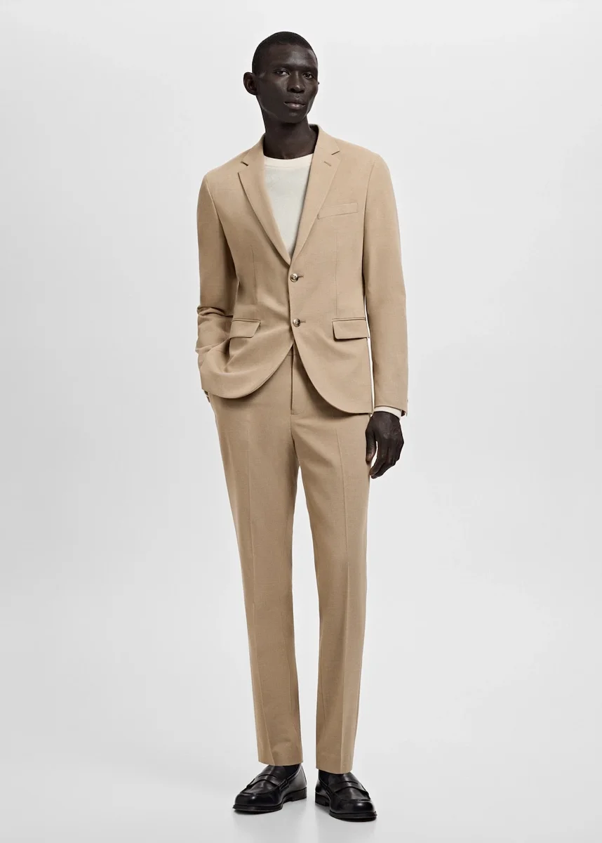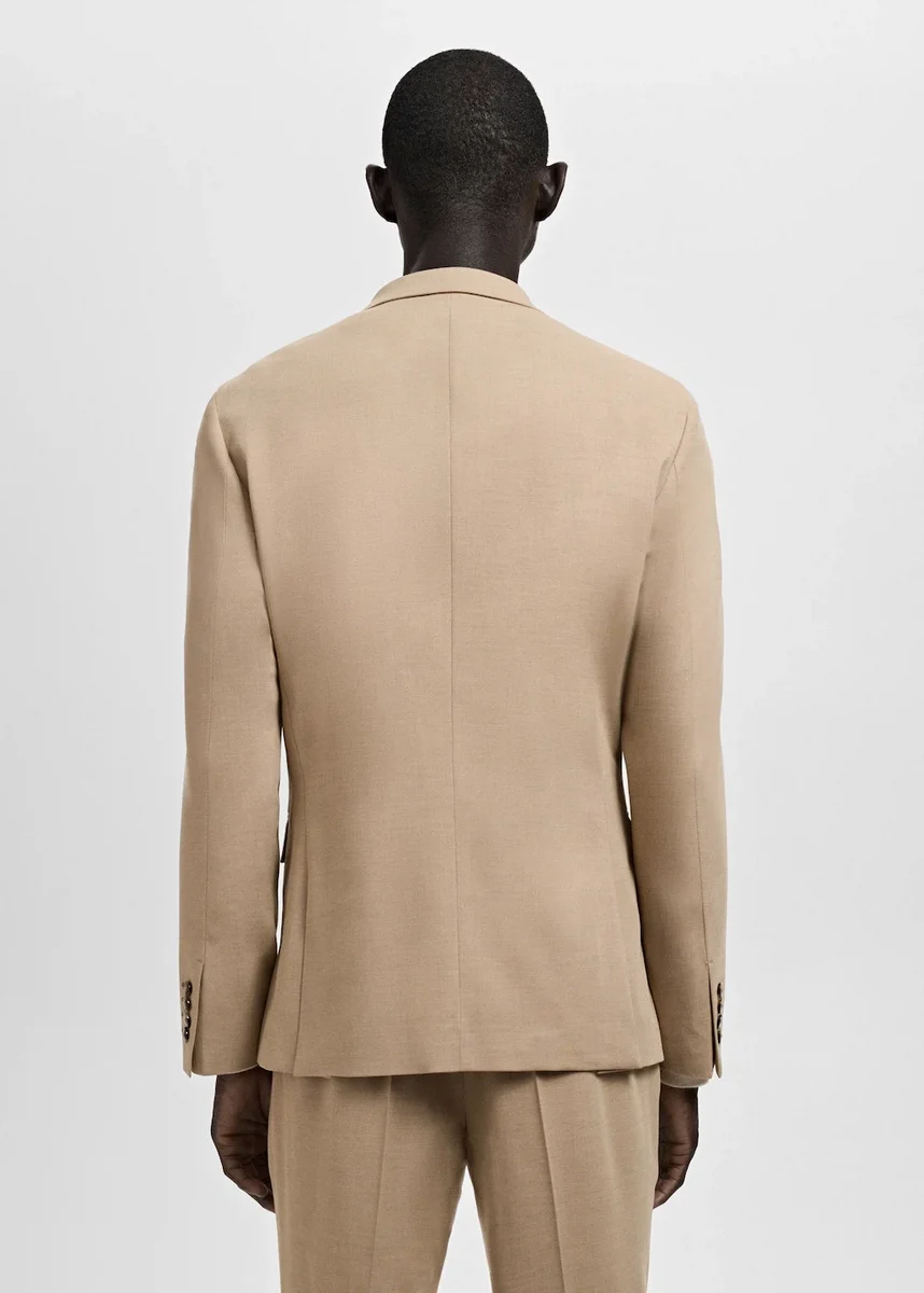Super slim fit. Klopový límec a knoflíková dírka. Jedna náprsní kapsa. Dvě kapsy s klopami na přední straně. Vnitřní kapsa. Vnitřní podšívka. Manžety na knoflíky. Lem se dvěma bočními rozparky. Zapínání na knoflíky vpředu.