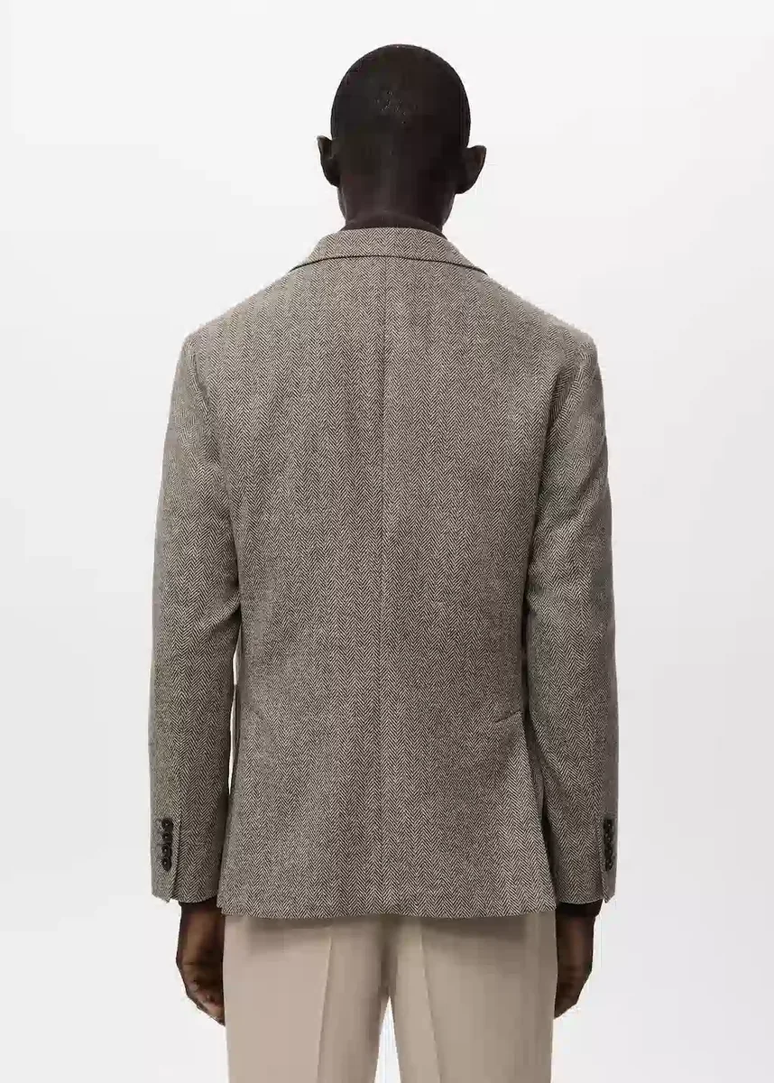 Úzký střih. Klopový límec a knoflíková dírka. Rybí kost. Dvě přední našité kapsy. Náprsní kapsa. Vnitřní kapsa. Vnitřní podšívka. Dlouhé rukávy s manžetami na knoflíky. Zapínání na knoflíky vpředu.