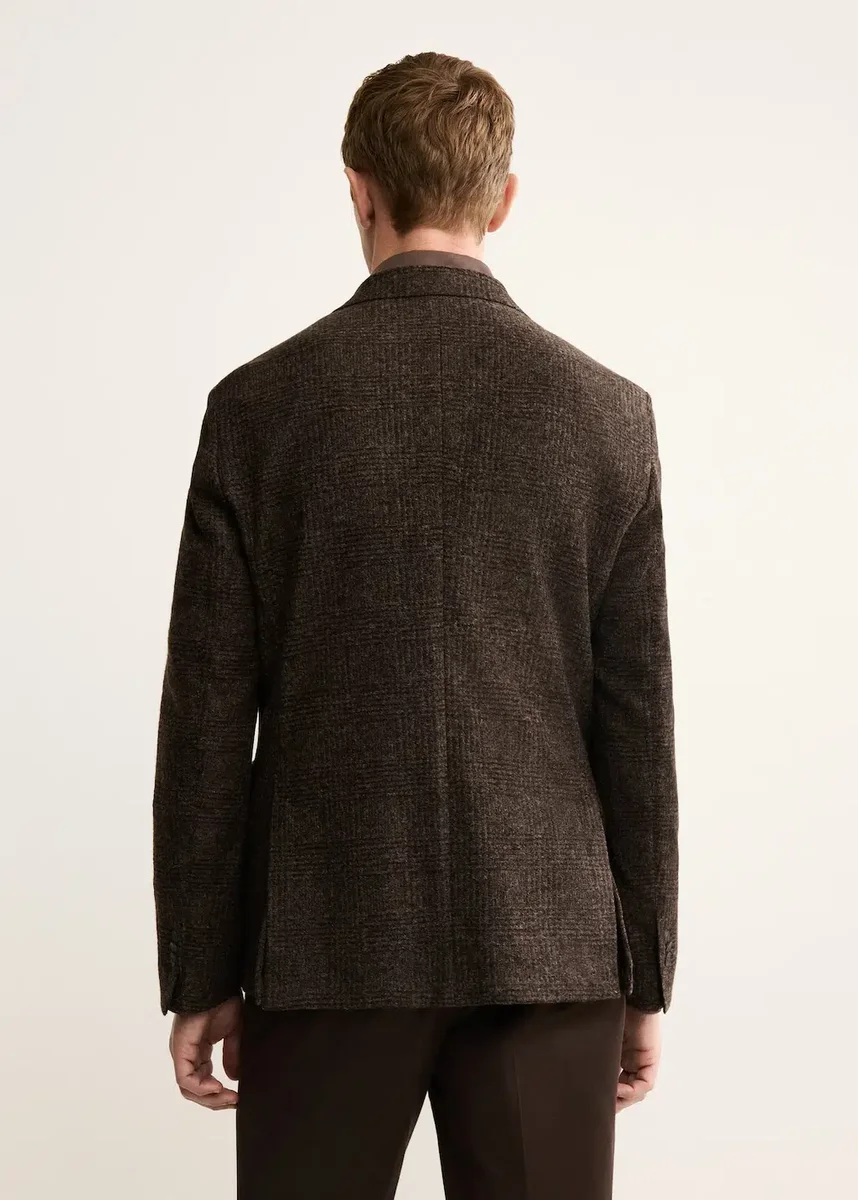 Italská vlněná tkanina. Klopový límec. Potisk s mikroskvrnami. Dvě kapsy s lemováním a knoflíky na vnitřní straně. Dvě našité kapsy na přední straně. Vnitřní kapsa. Zapínání na dva knoflíky vpředu.