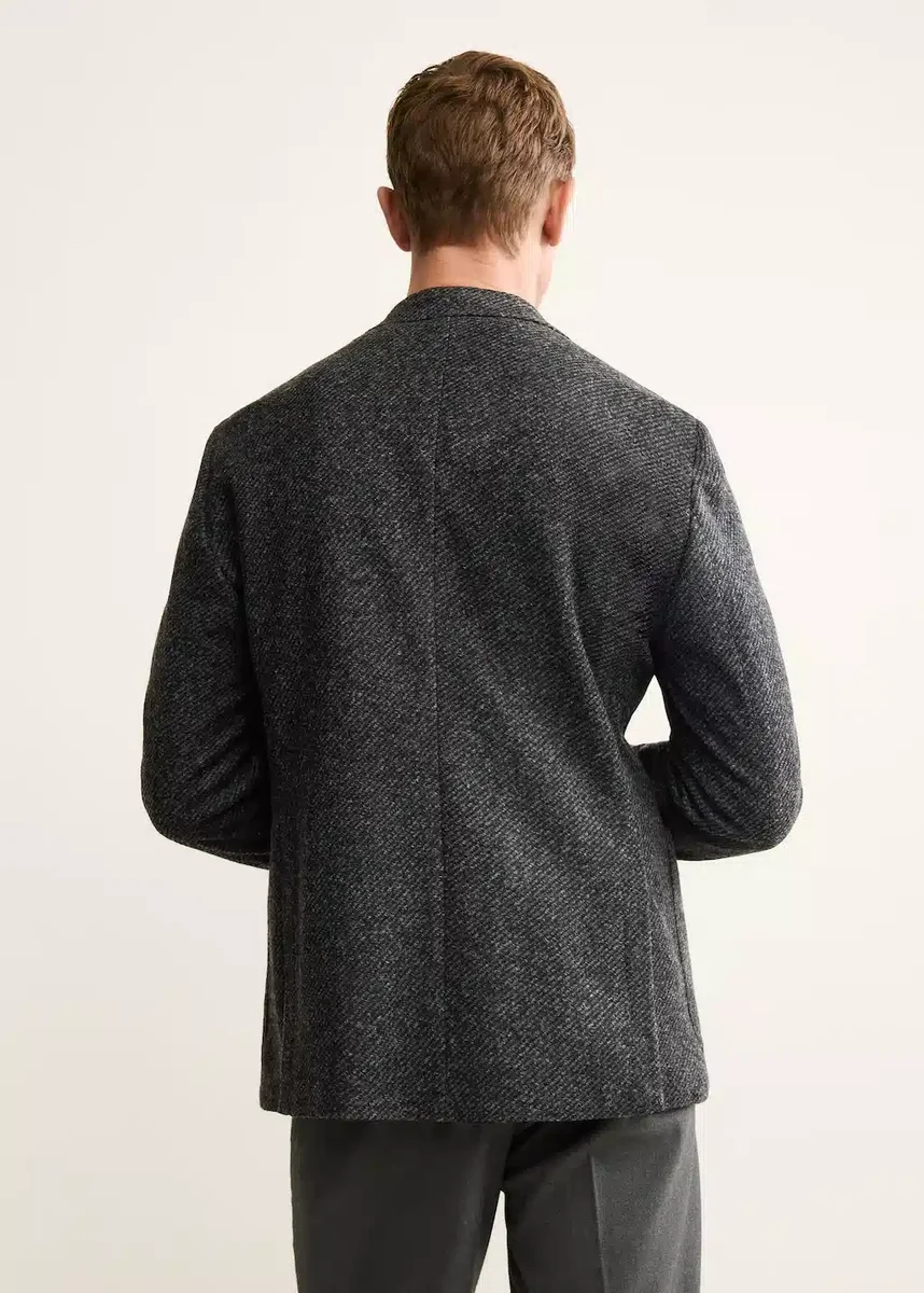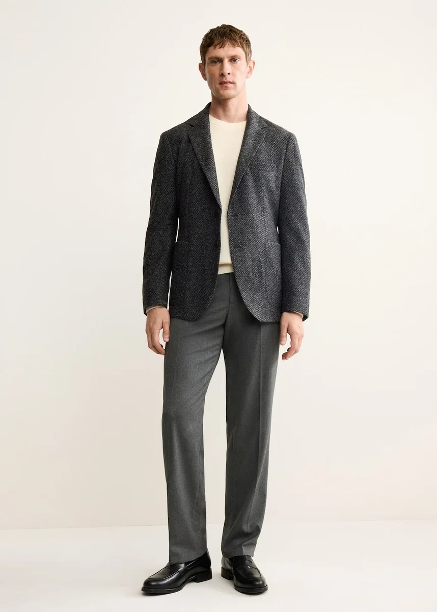 Úzký střih. Tkanina z italské vlny. Klopový límec. Zapínání na dva knoflíky. Náprsní kapsa. Dvě našité kapsy vpředu. Dlouhé rukávy s manžetami na knoflíky. Vnitřní kapsy.