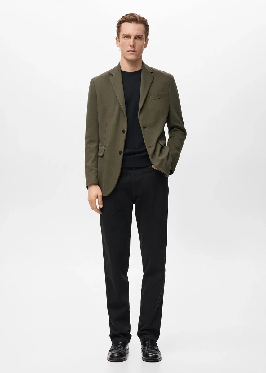 Úzký střih. Bavlněná směsová tkanina. Náprsní kapsa s lemováním. Dvě boční kapsy s klopami. Manžety s knoflíky. Dvojitý zadní rozparek na lemu. Zapínání na knoflíky vpředu.