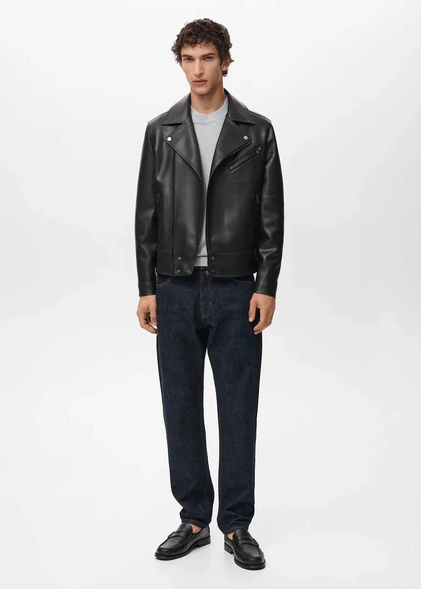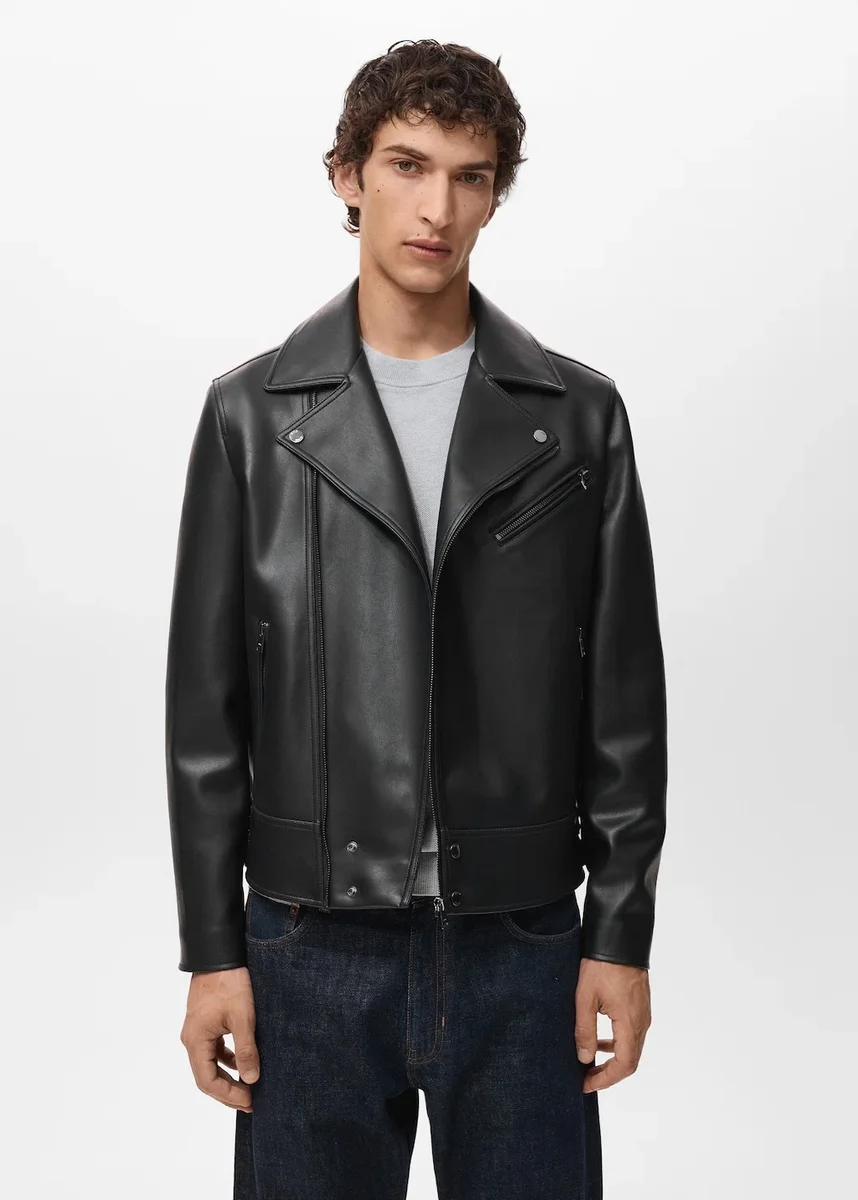 Úzký střih. Kožený efekt. Límec s klopami. Motorkářský design. Dlouhé rukávy se zipem na manžetách. Asymetrické zapínání na zip. Tři kapsy na zip. Vnitřní kapsa. Vnitřní podšívka. Nastavitelný lem s knoflíkem.