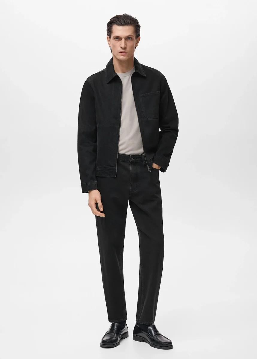 Slim fit. 100% bavlna v denimovém stylu. Košilový límec. Zapínání na zip vpředu. Dlouhé rukávy s manžetami na knoflíky. Dvě boční kapsy s lemováním. Nastavitelné poutka vzadu