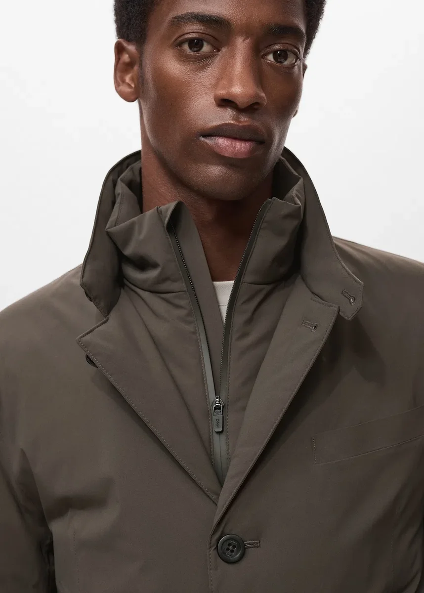 Rovný střih. THERMOLITE®: tkanina, která díky technologii vláken nabízí tepelnou izolaci a prodyšnost. Voděodolná: Tato odolná úprava zabraňuje pronikání vody skrz tkaninu a poskytuje tak nejlepší možnou ochranu před deštěm. Větruodolná: Tento odolný materiál nabízí ochranu před větrem pro větší pohodlí při outdoorových aktivitách. Límec s klopami. Límec Perkins s odnímatelným zapínáním na zip. Dvě přední kapsy s klopou a skrytým zapínáním. Vnitřní kapsa na zip. Zapínání na knoflíky. Manžety na knoflíky. Sbalitelné: Oděv má vnitřní kapsu pro vlastní uložení. VÝKON: Kolekce oděvů vyrobených z technických vláken. Tato kolekce nabízí širokou škálu pokročilých funkcí, jako jsou bi-stretchové tkaniny a rychleschnoucí, snadno žehlitelné, termoregulační, prodyšné nebo vodoodpudivé vlastnosti, rozdělené do tří obecných kategorií: Termoregulační, Funkční a Komfortní.
