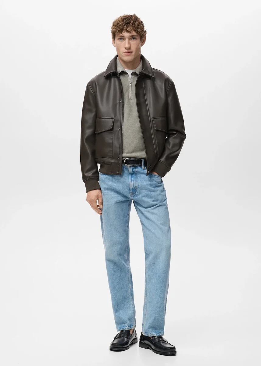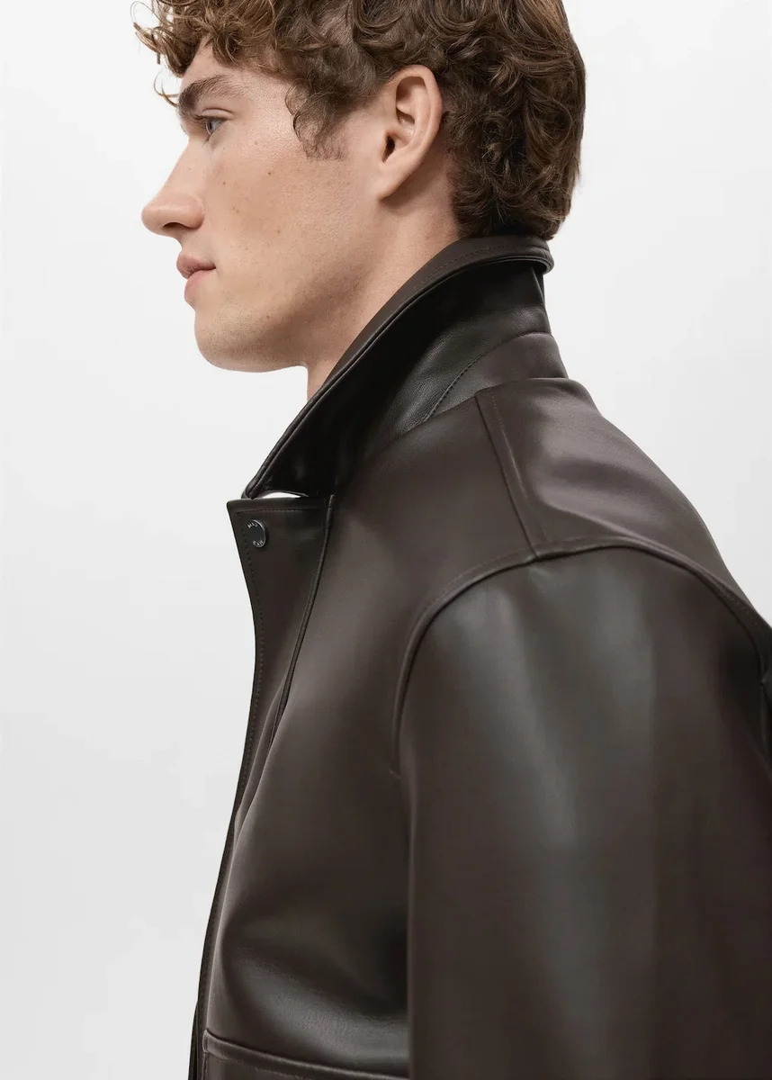 Umělá kůže. Rovný střih. Dvě přední kapsy. Zapínání na zip a knoflík. Dlouhé rukávy. Žebrované lemy.