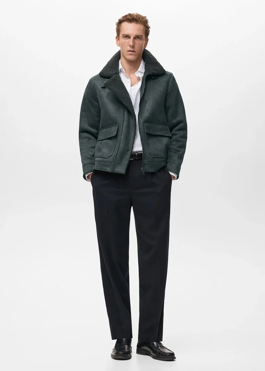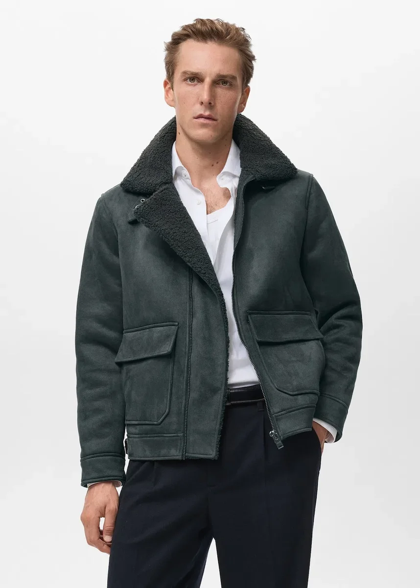Umělá semišová kůže. Rovný střih. Vnitřek z umělé ovčí kůže. Dvě přední kapsy. Zapínání na zip vpředu