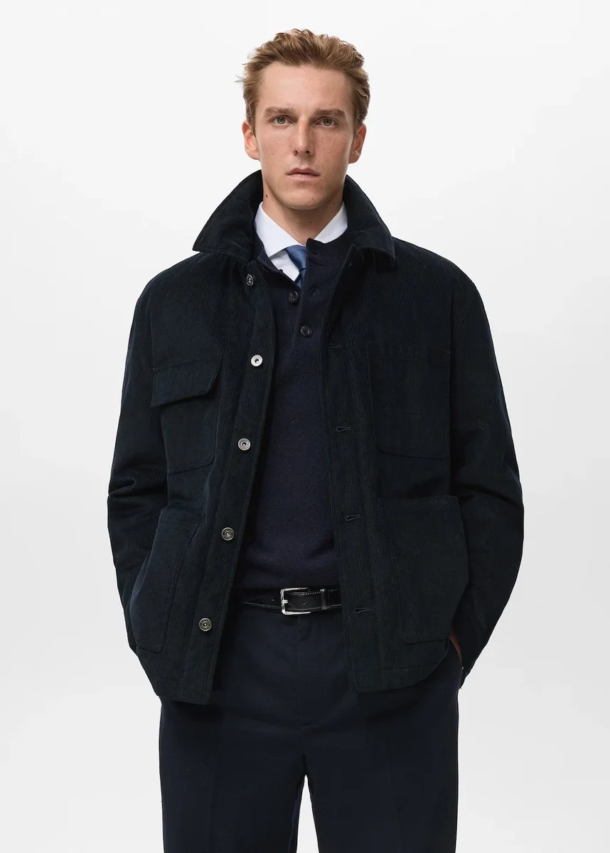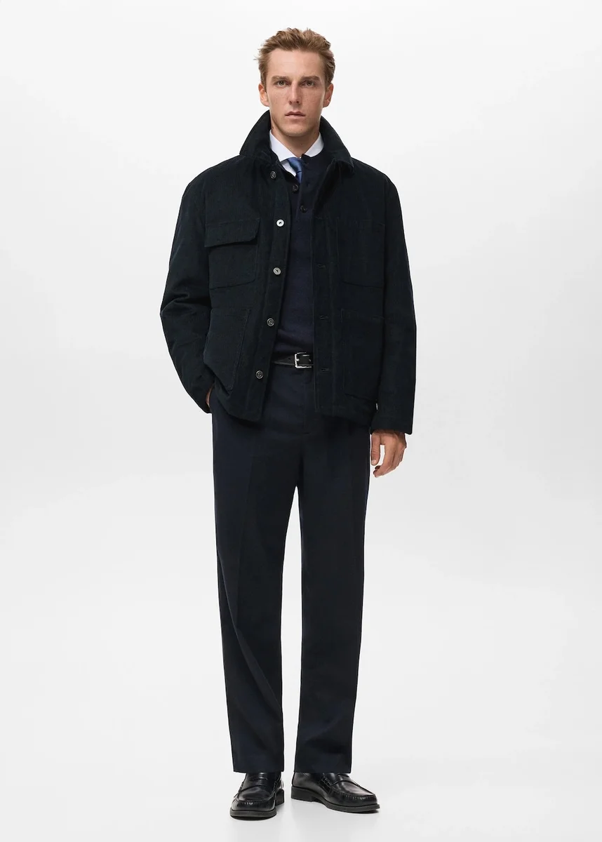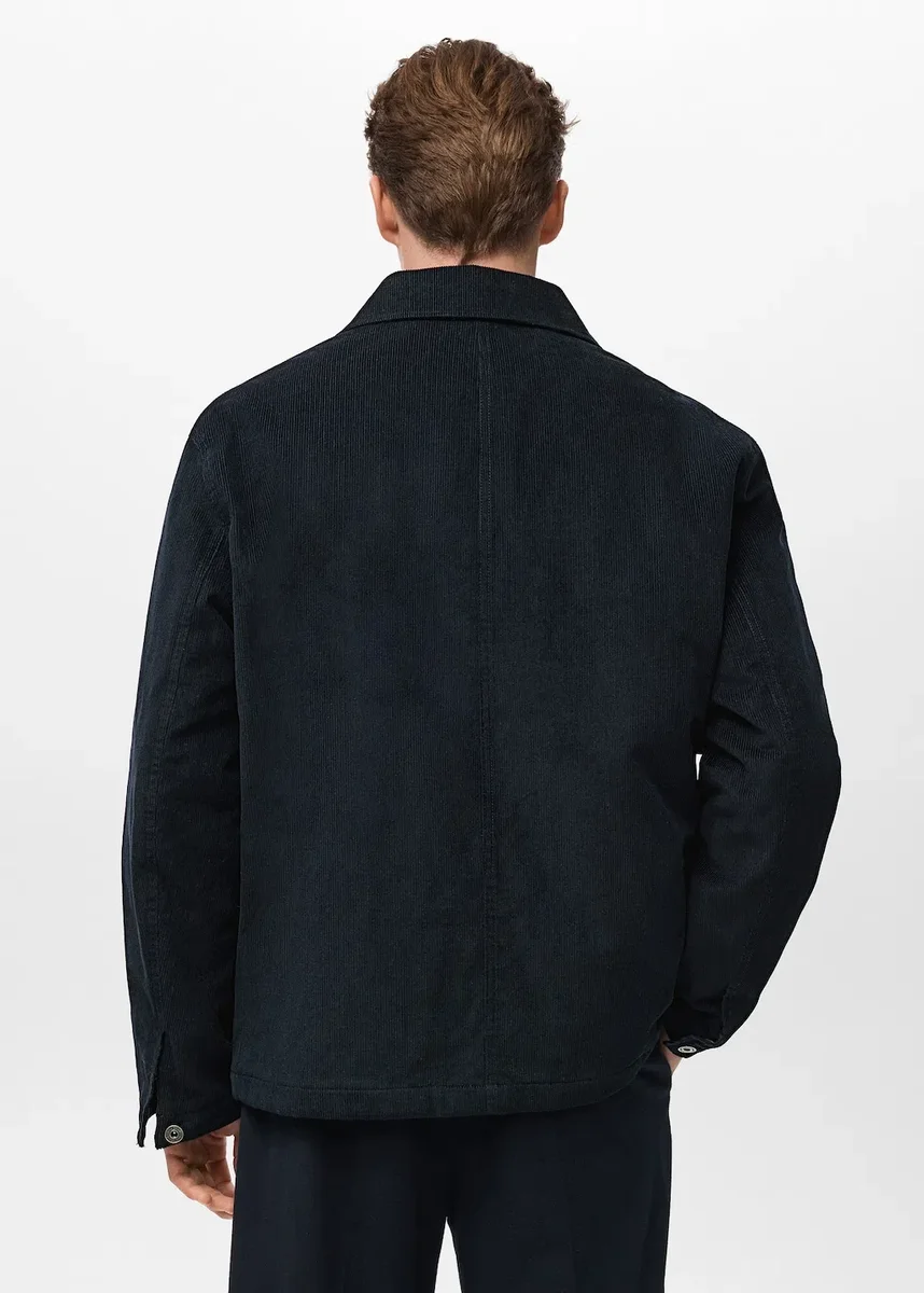 Rovný střih. Bavlněná směsová tkanina. Manšestrová tkanina. Čtyři kapsy na přední straně. Košilový límec. Zapínání na knoflíky vpředu. Dlouhé rukávy s manžetami na knoflíky