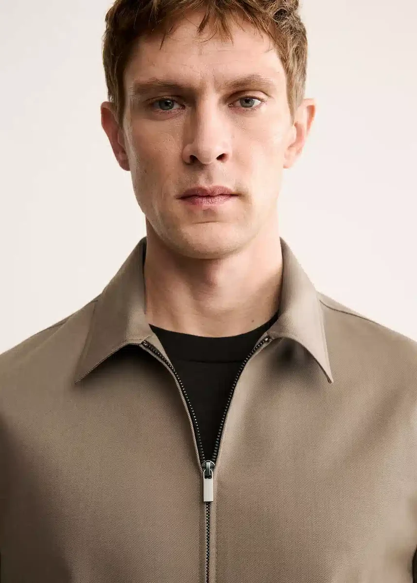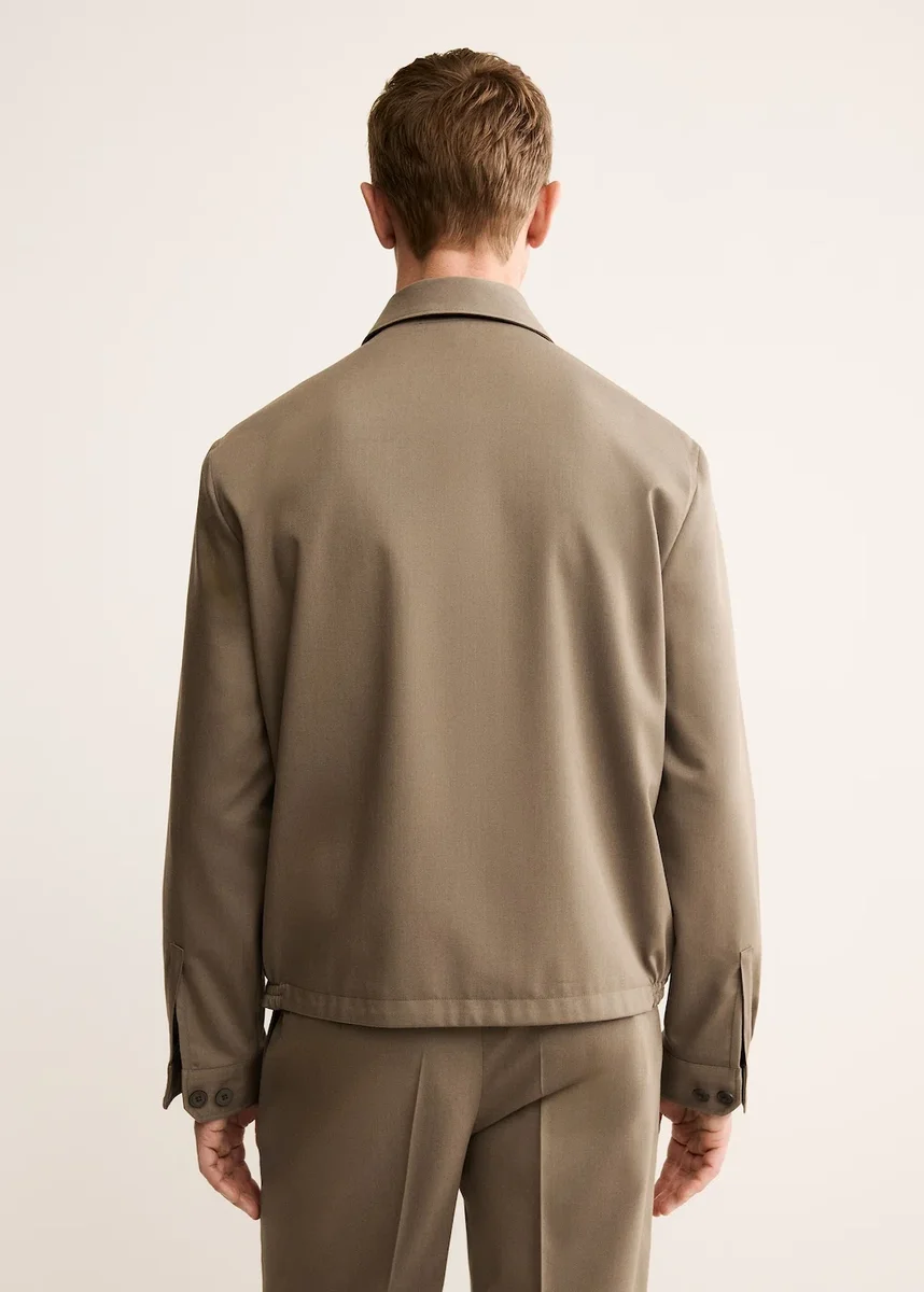 Text. Slim silueta. Sada k dispozici jako celkový look. Vlněná tkanina. Košilový límec. Dvě boční kapsy s lemováním. Vnitřní kapsa s lemováním. Dlouhé rukávy s manžetami na knoflíky. Vnitřní podšívka. Zapínání na zip vpředu.