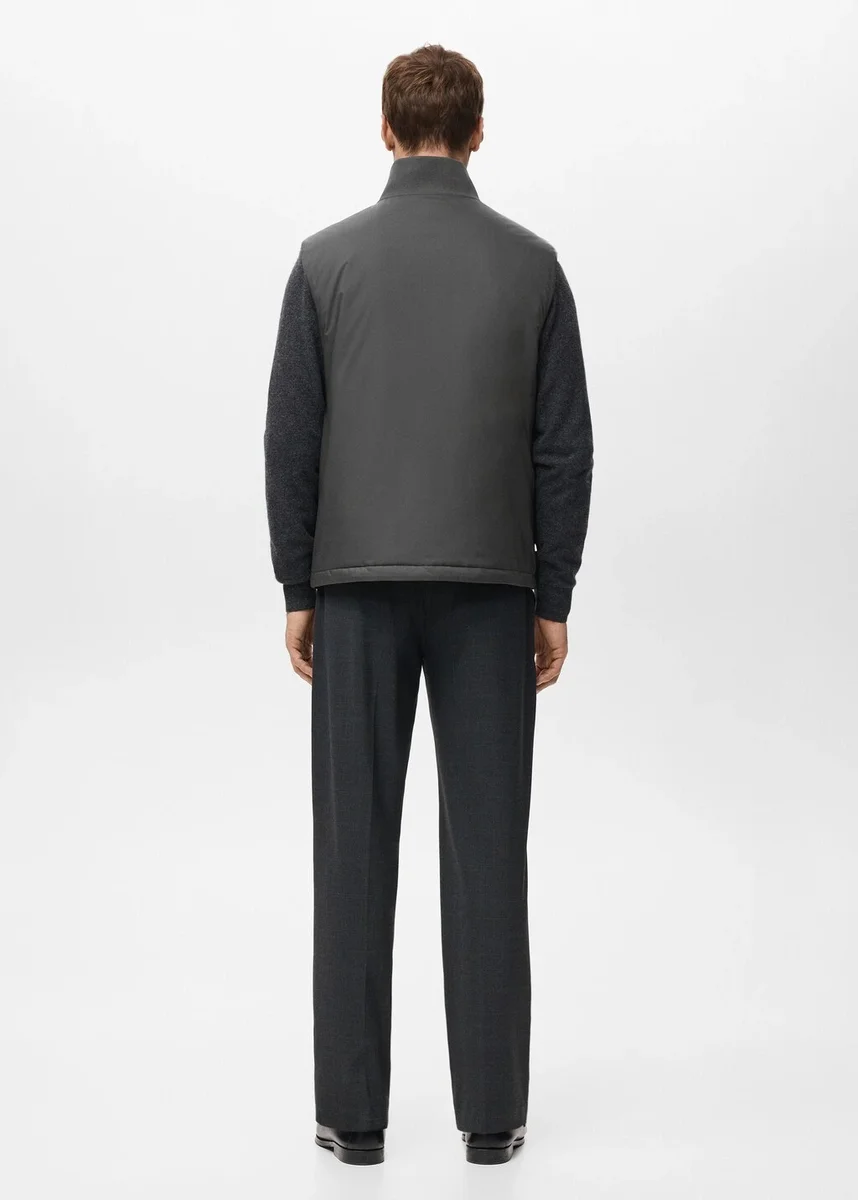 Rovný střih. Prošívaný design. Pletený límec. Dvě přední kapsy. Vnitřní kapsa s lemem. Bez rukávů. Zapínání na zip vpředu.
