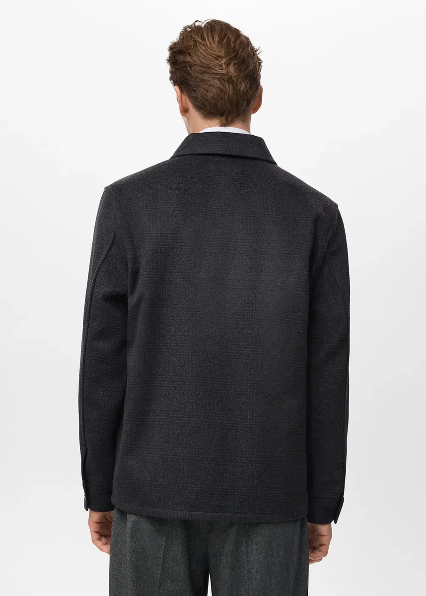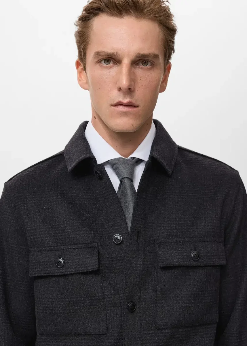 Směs vlny. Rovný střih. Kostkovaný vzor. Košilový límec. Dvě náprsní kapsy s klopou a dvěma knoflíky. Dlouhé rukávy s manžetami na knoflíky. Zapínání na knoflíky vpředu.