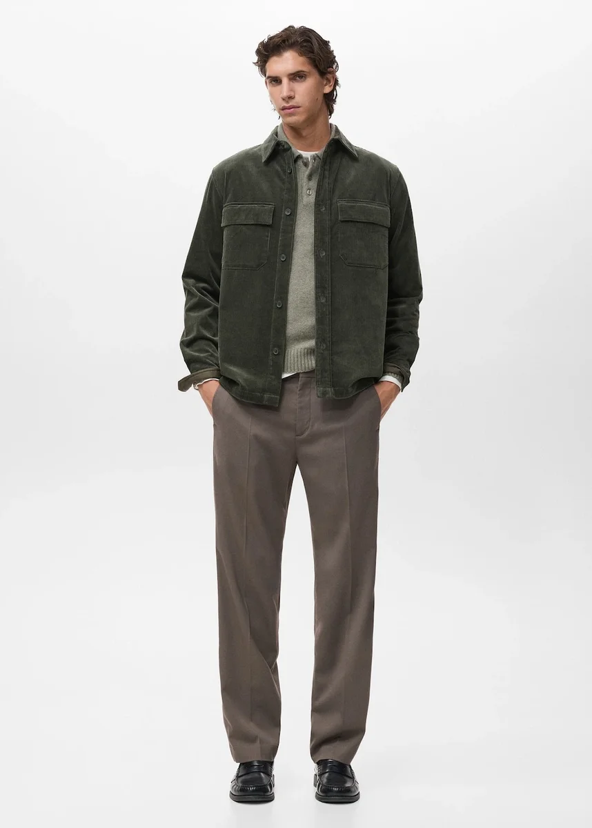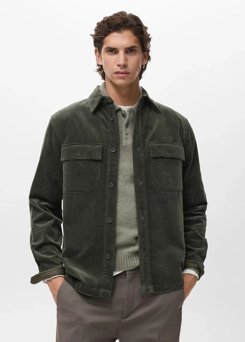 Volný střih. Bavlněná tkanina. Manšestrová tkanina. Dvě našité kapsy s klopami na hrudi. Košilový límec. Dlouhé rukávy s manžetami na knoflíky. Zapínání na knoflíky