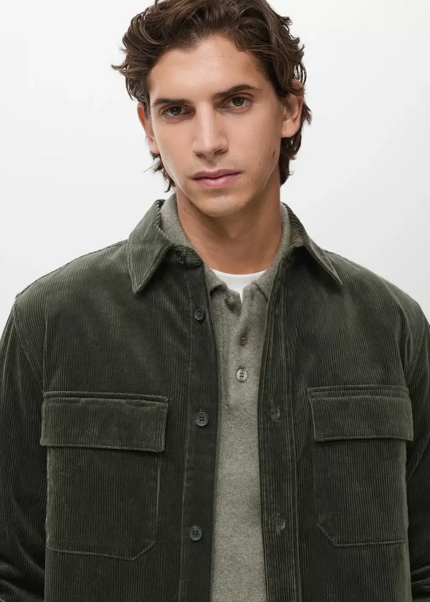 Volný střih. Bavlněná tkanina. Manšestrová tkanina. Dvě našité kapsy s klopami na hrudi. Košilový límec. Dlouhé rukávy s manžetami na knoflíky. Zapínání na knoflíky.