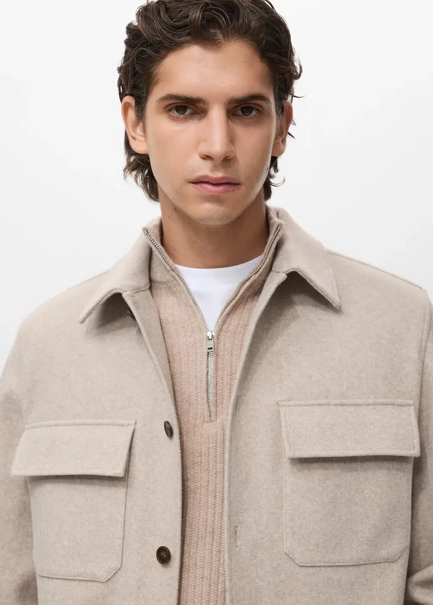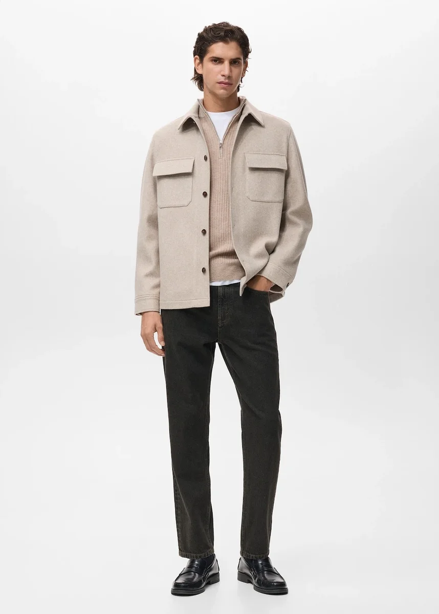 Rovný střih. Košilový límec. Dvě náprsní kapsy s klopami. Zapínání na knoflíky vpředu. Dlouhé rukávy s manžetami na knoflíky. Zaoblený spodní lem.
