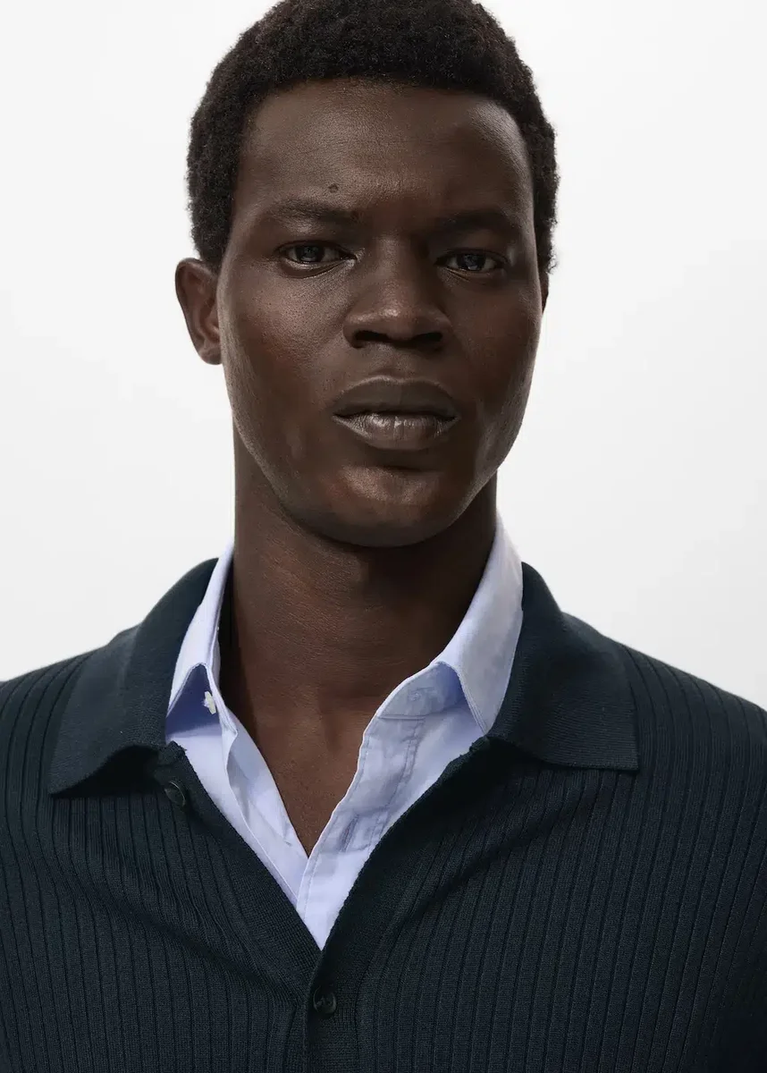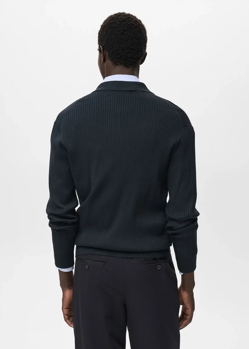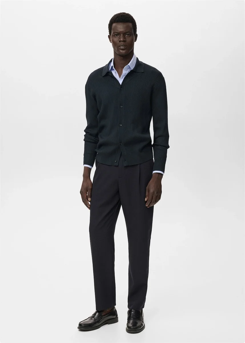 Rovný střih. Žebrovaná pletenina. Košilový límec. Zapínání na knoflíky vpředu. Dlouhé rukávy. Žebrovaný výstřih, manžety a lem.