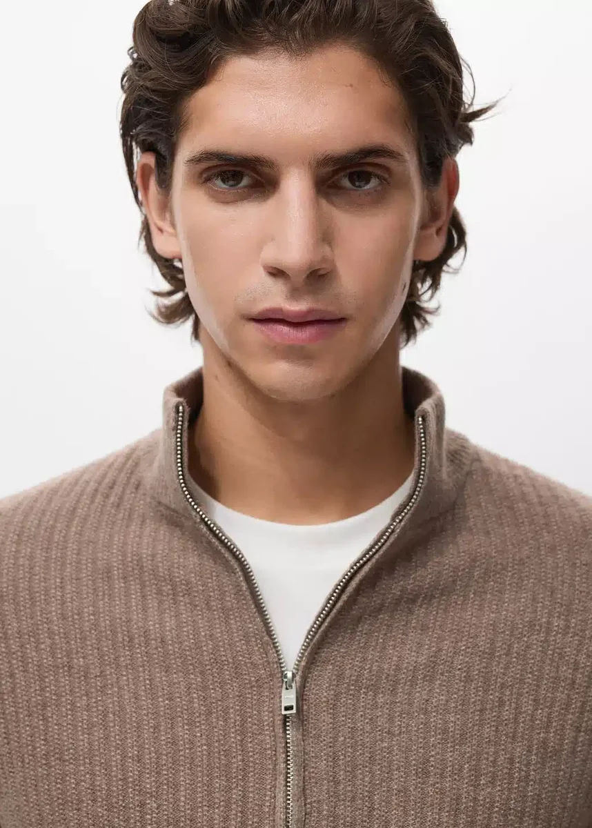 Rovný střih. Pletenina. Kabelkový vzor. Stojací límec. Dlouhé rukávy s elastickými manžetami. Žebrovaný lem na rukávech a spodním okraji. Zapínání na zip vpředu.