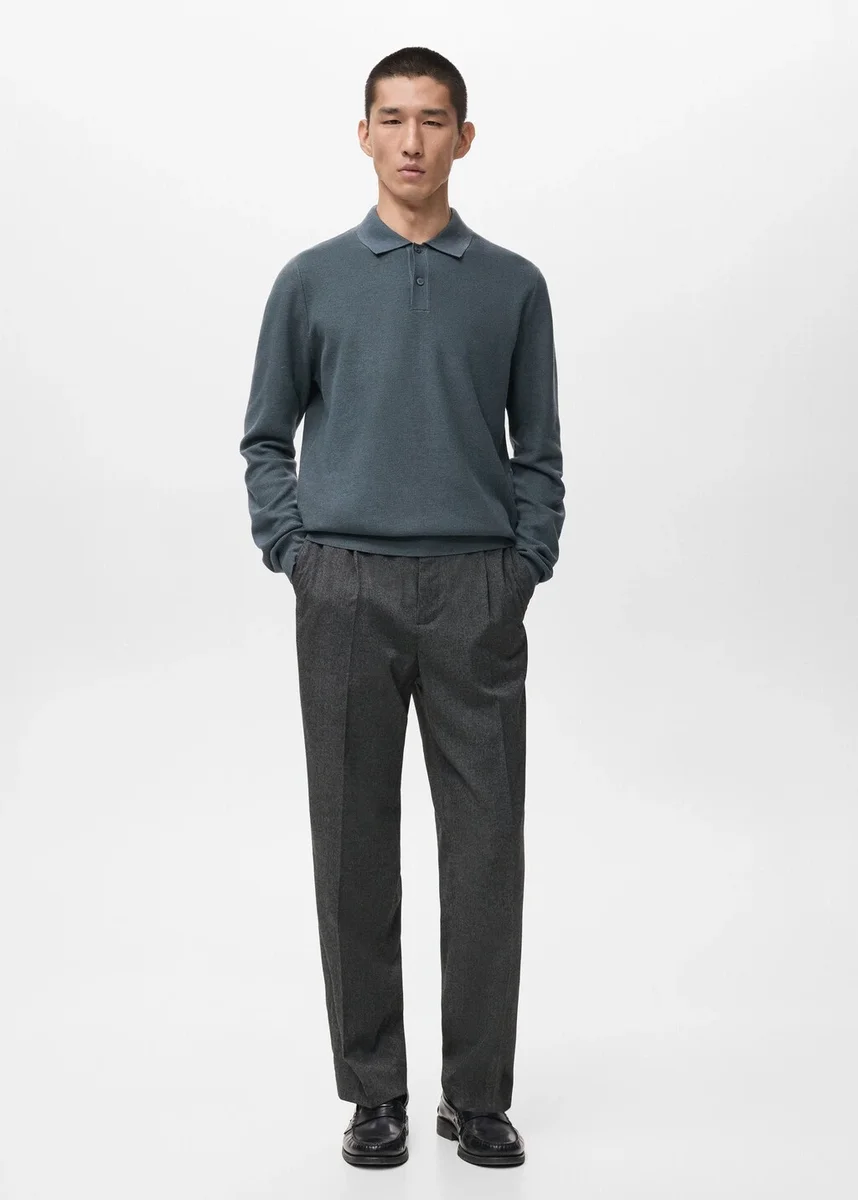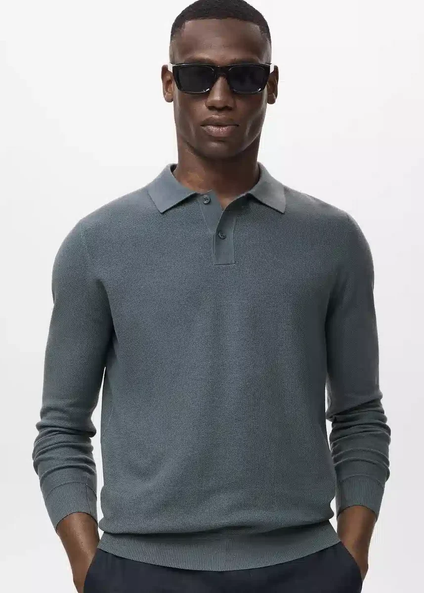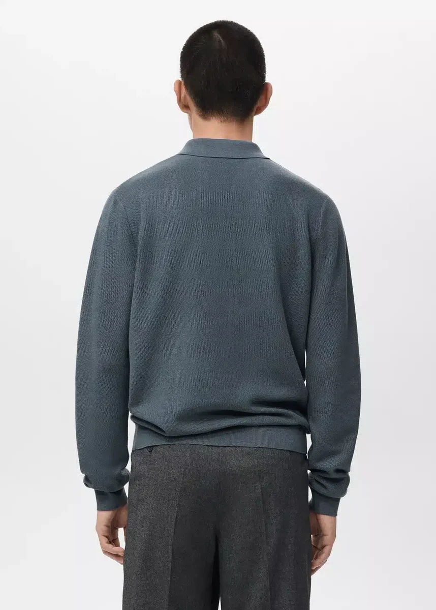 Rovný střih. Bavlněná směsová tkanina. Jemně pletená tkanina s mikrostrukturou. Polo límec. Dlouhý rukáv. Žebrovaný límec, rukávy a lem