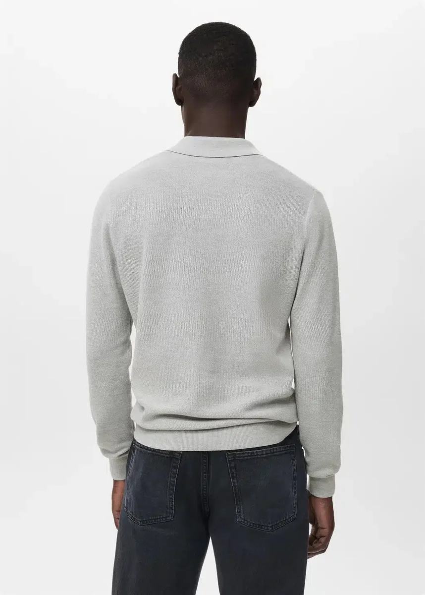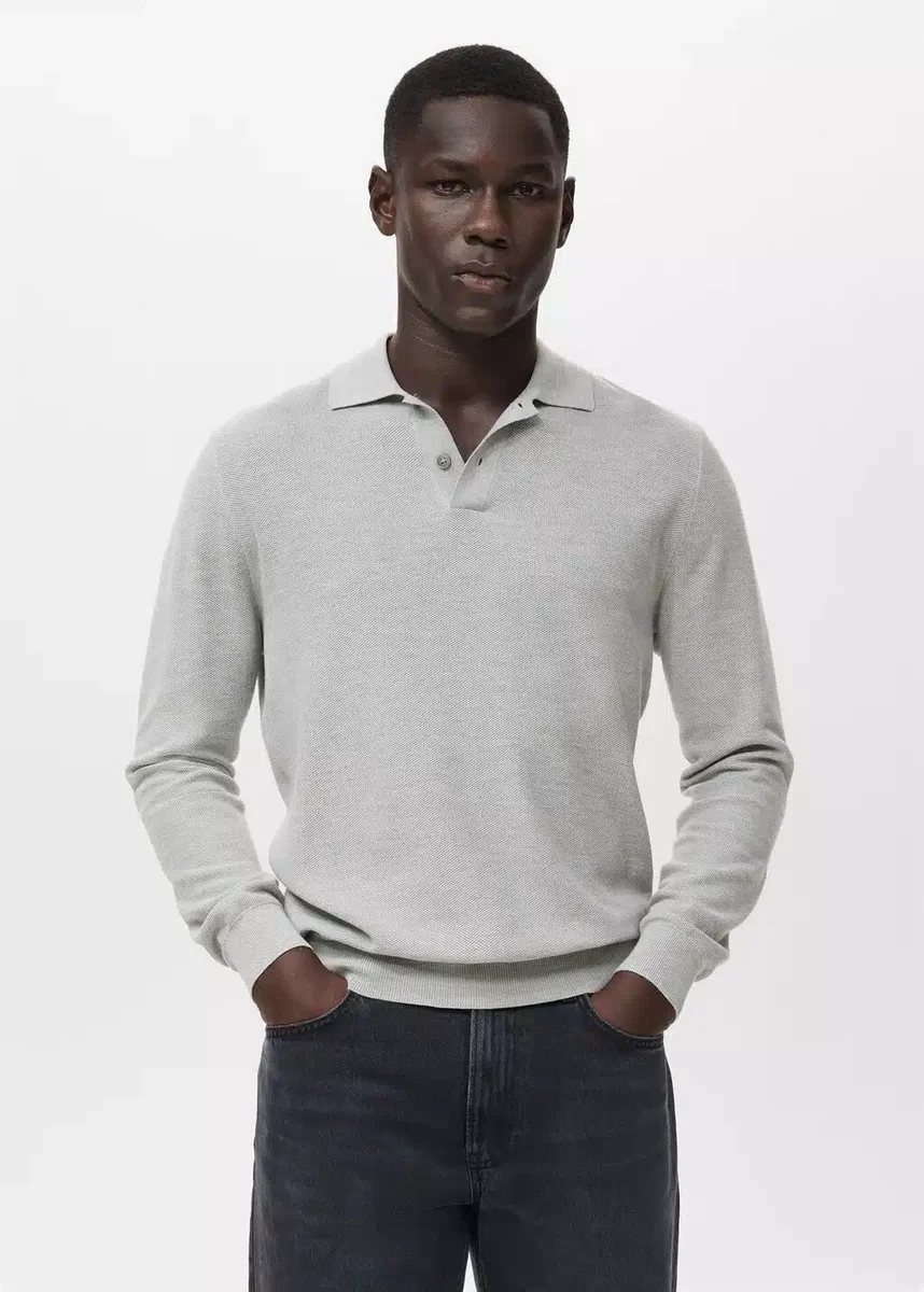 Rovný střih. Bavlněná směsová tkanina. Jemně pletená tkanina s mikrostrukturou. Polo límec. Dlouhý rukáv. Žebrovaný límec, rukávy a lem