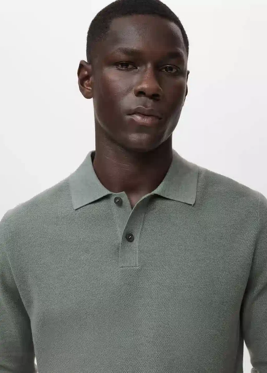 Rovný střih. Bavlněná směsová tkanina. Jemně pletená tkanina s mikrostrukturou. Polo límec. Dlouhý rukáv. Žebrovaný límec, rukávy a lem