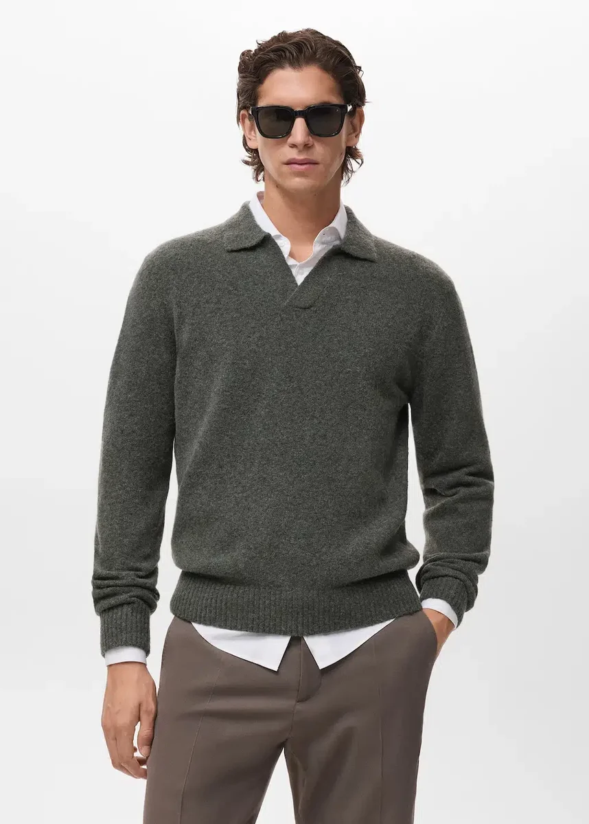 Rovný střih. Směsová vlna. Polo límec. Dlouhé rukávy. Rovný lem. Žebrované manžety a lem
