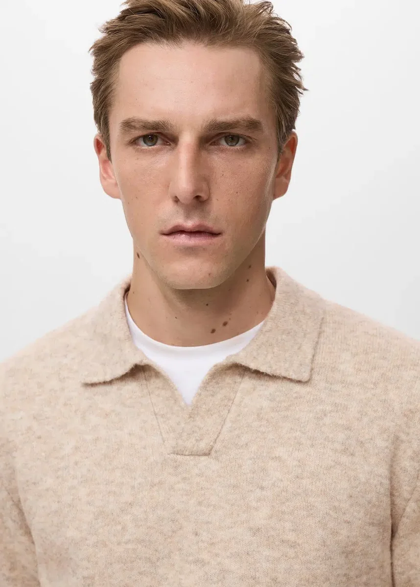 Rovný střih. Směsová vlna. Polo límec. Dlouhé rukávy. Rovný lem. Žebrované manžety a lem