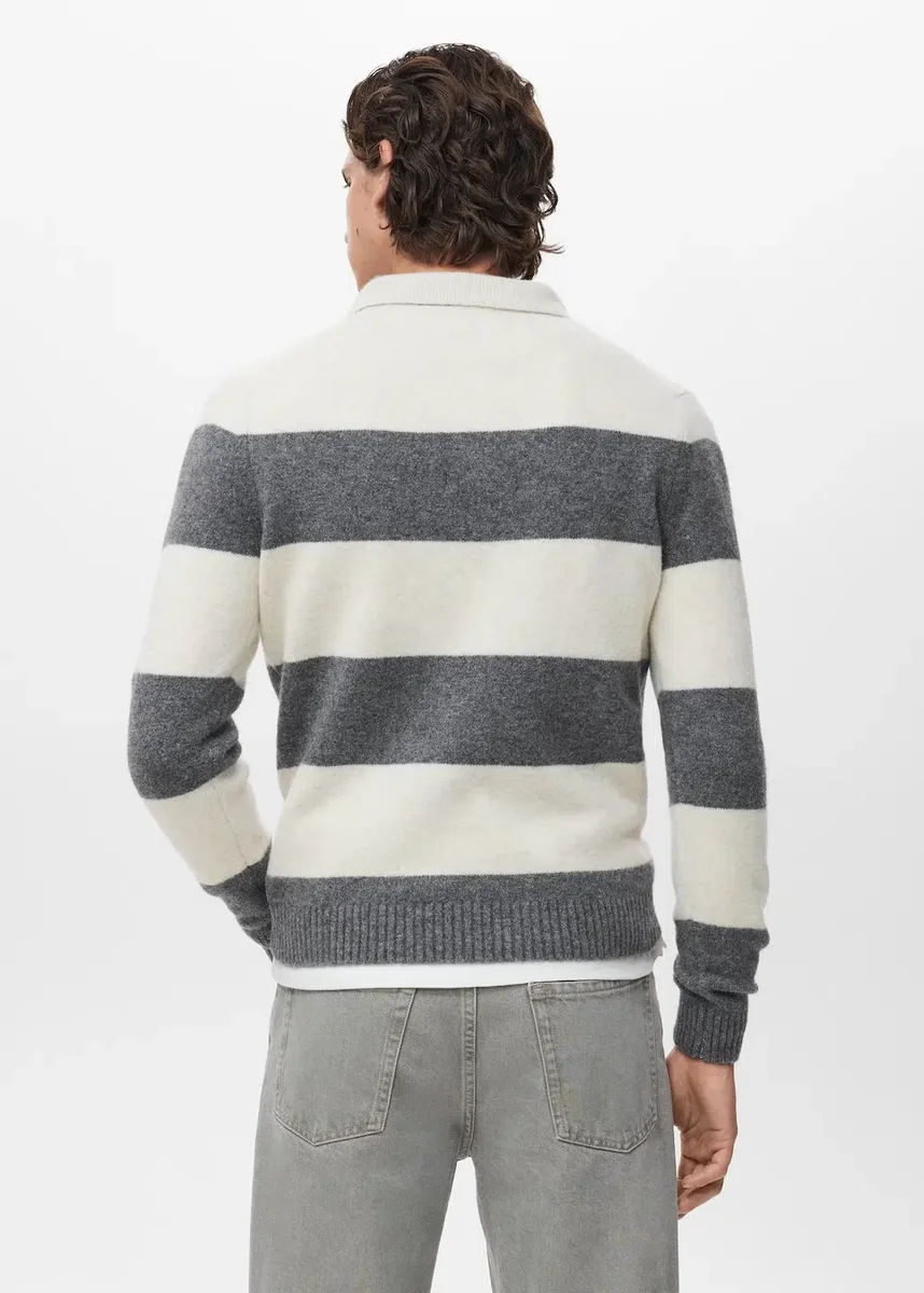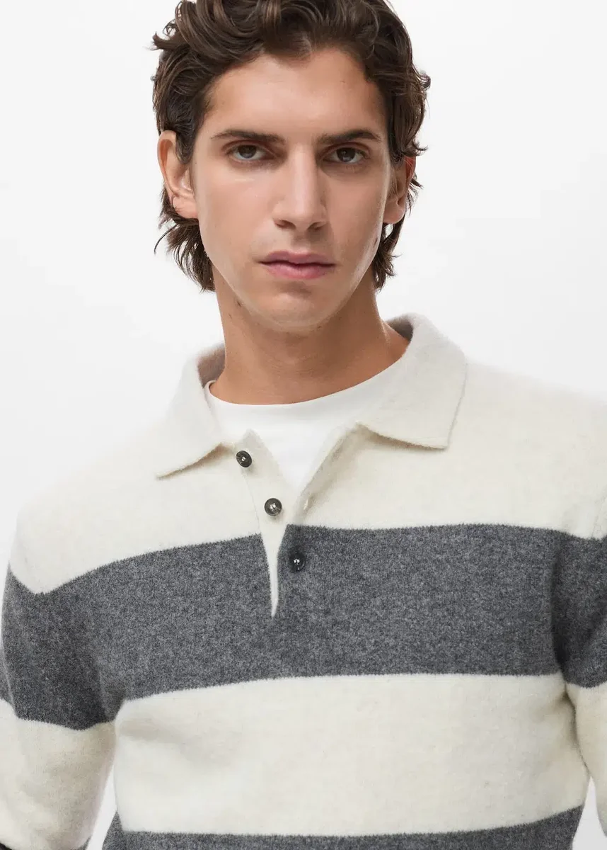 Směsová vlna. Pruhovaný střih. Rovný střih. Polo límec se zapínáním na knoflíky. Žebrované manžety.