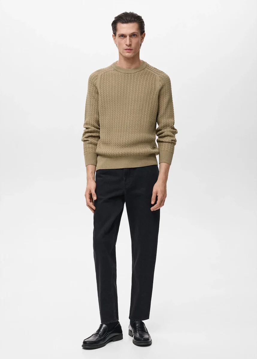 100% bavlna. Rovný střih. Silný úplet. Pletený vzor. Kulatý výstřih. Dlouhé rukávy. Rovný lem. Žebrované zakončení rukávů a lemu
