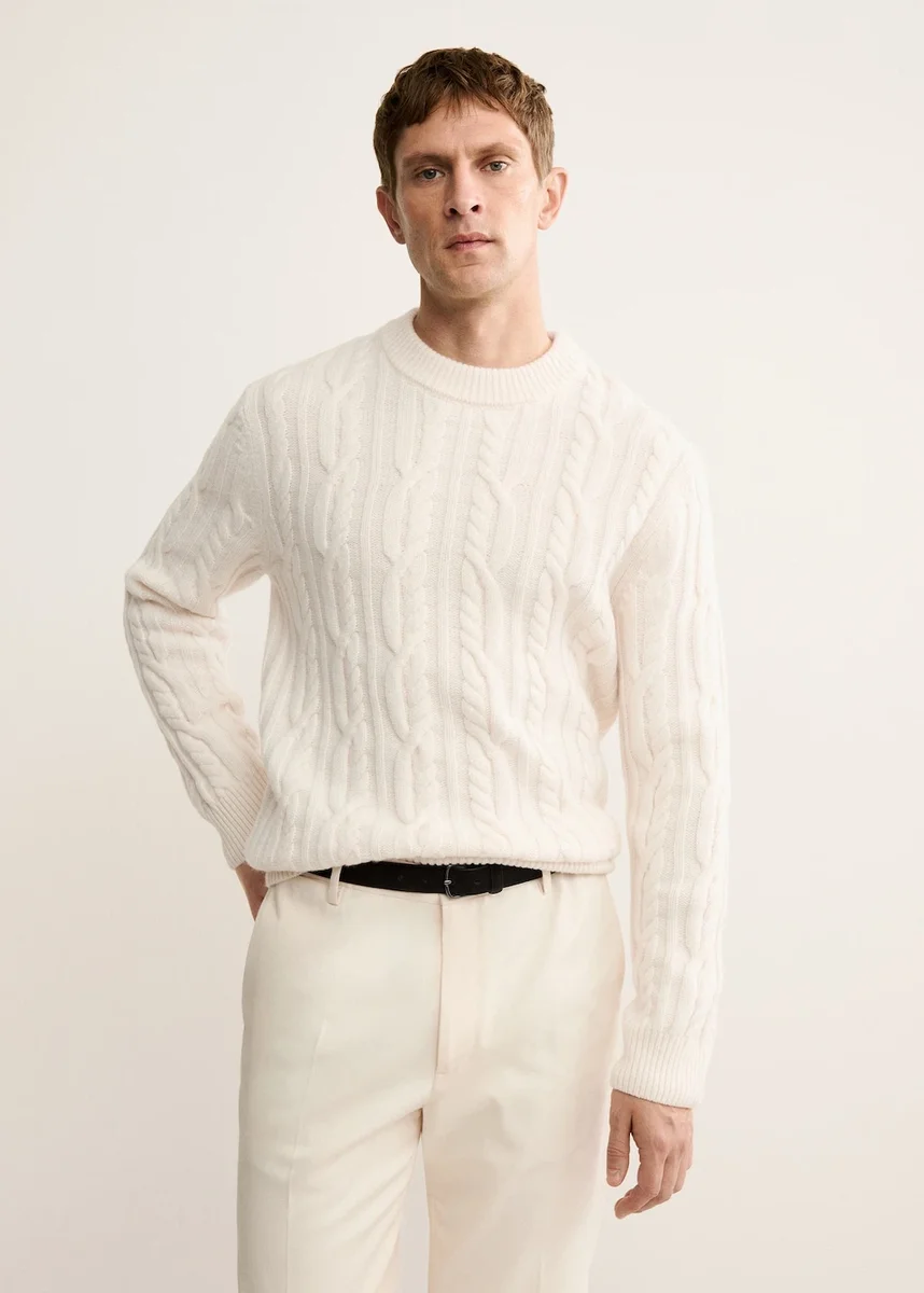 100% vlněná tkanina. Pletený design. Kulatý výstřih. Rovný střih. Dlouhé rukávy s elastickými manžetami. Žebrovaný výstřih, manžety a lem. Rovný lem.