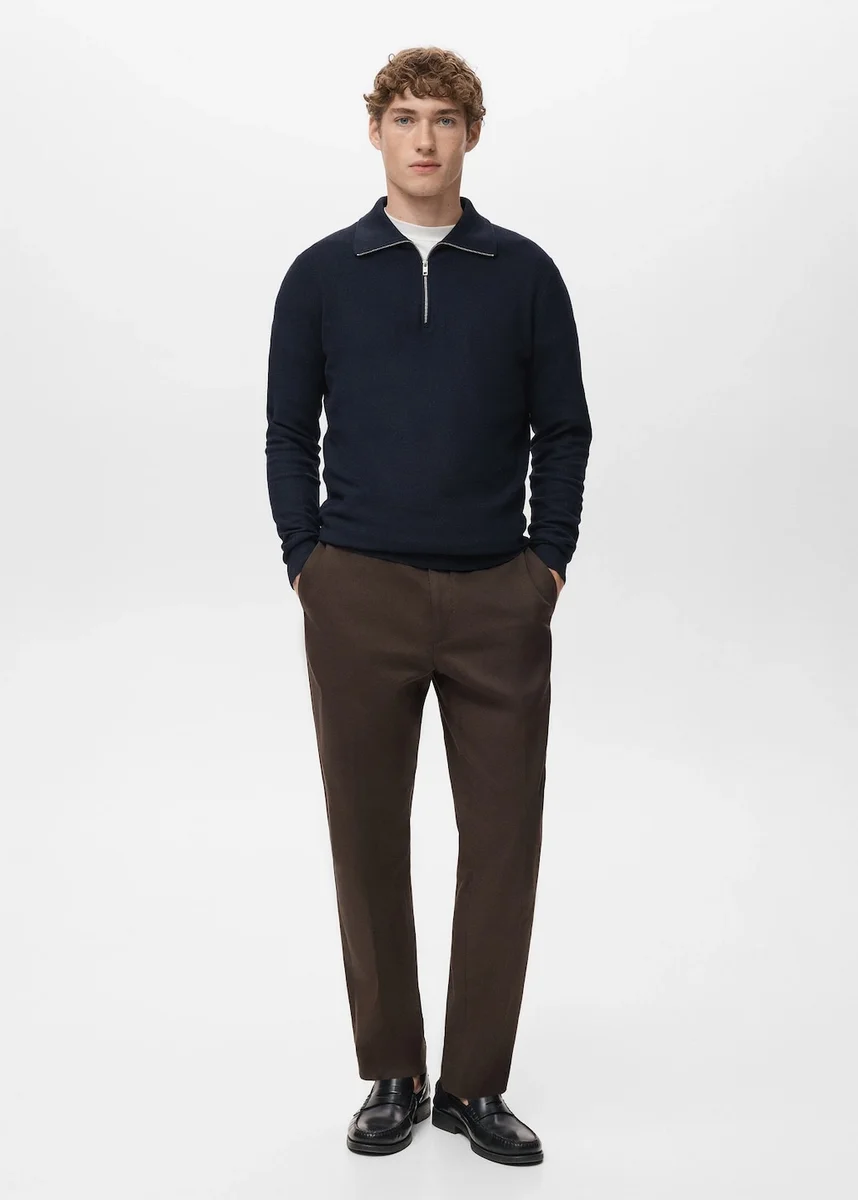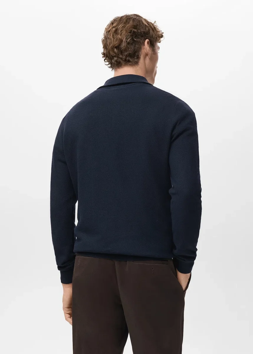 Standardní délka. Dlouhé rukávy. Rovný střih. Jemná pletenina. Zapínání na krku. Perkinsův límec. Rovný střih. Směs bavlny. Jemně pletená tkanina s mikrostrukturou. Límec s zipem. Žebrovaný límec, manžety a lem. Rovný lem.
