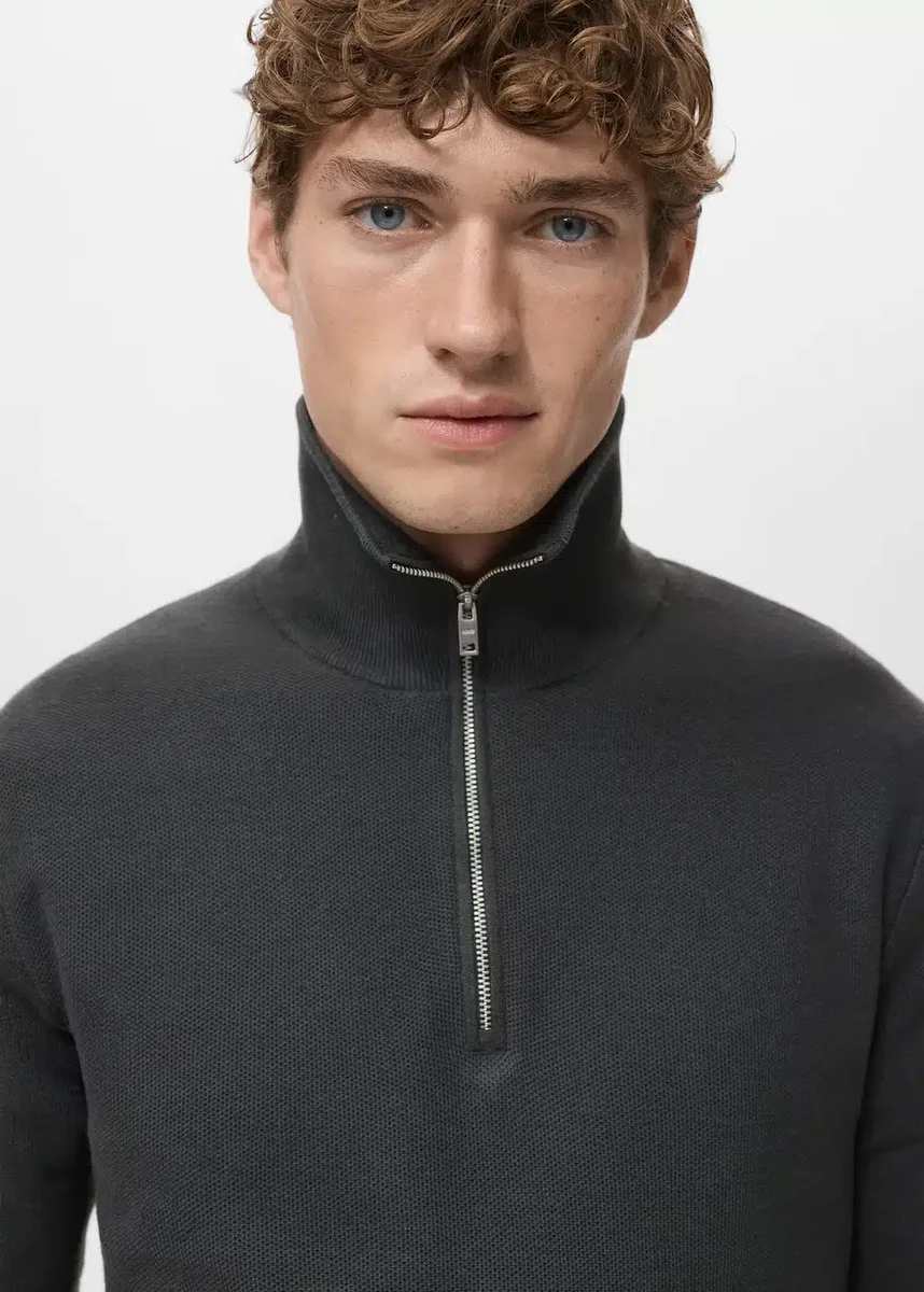 Standardní délka. Dlouhé rukávy. Rovný střih. Jemná pletenina. Zapínání na krku. Perkinsův límec. Rovný střih. Směs bavlny. Jemně pletená tkanina s mikrostrukturou. Límec s zipem. Žebrovaný límec, manžety a lem. Rovný lem.
