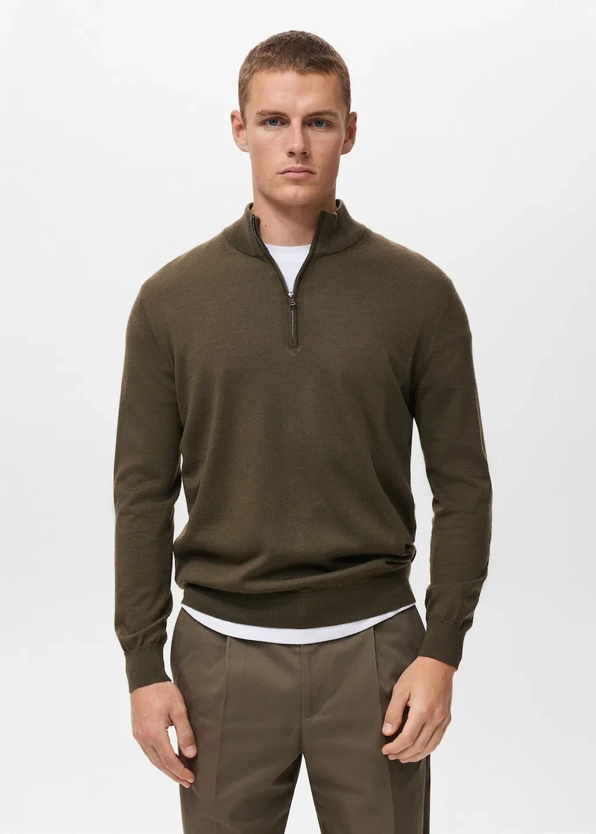 Regular fit. 100% merino vlna. Jemně pletená tkanina. Perkinsův límec se zapínáním na zip. Žebrovaný límec, rukávy a lem.