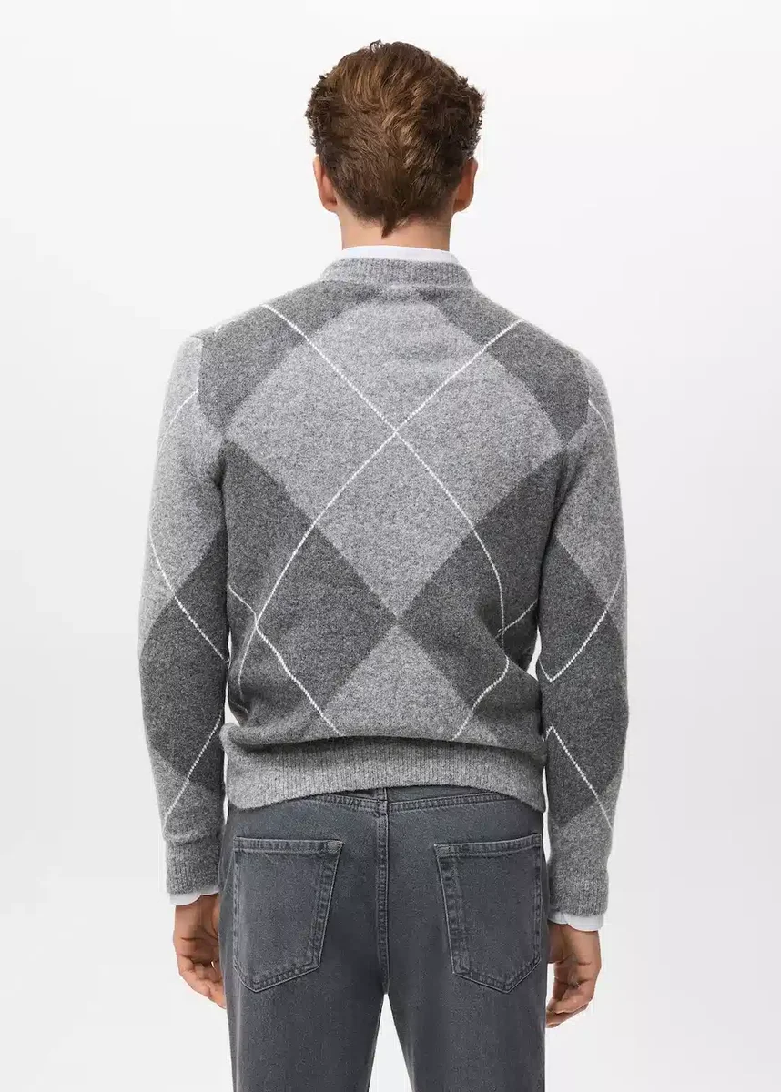 Pletená látka. Standardní délka. Rovný střih. Kosočtvercový vzor. Kulatý výstřih. Žebrované manžety.
