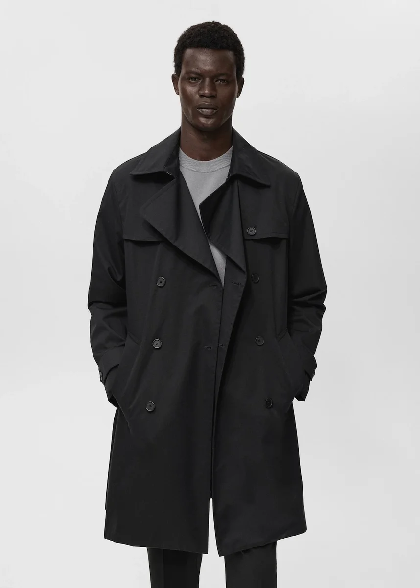 Kolekce Casper Ruud x Mango. Vodoodpudivý: Technická vodoodpudivá tkanina. Bavlněná směsová tkanina. Klopový límec a knoflíková dírka. Kovový háček na zapínání u krku. Design s dvouřadým zapínáním vpředu. Ozdobné ramenní popruhy. Odnímatelný pásek. Dvě kapsy s knoflíky vpředu. Dlouhé rukávy. Vnitřní podšívka. Vnitřní kapsa. Zadní rozparek na lemu. Složení: 60 % bavlna, 40 % polyester Podšívka: 55 % polyester, 45 % viskóza Vnitřní límec: 100 % bavlna