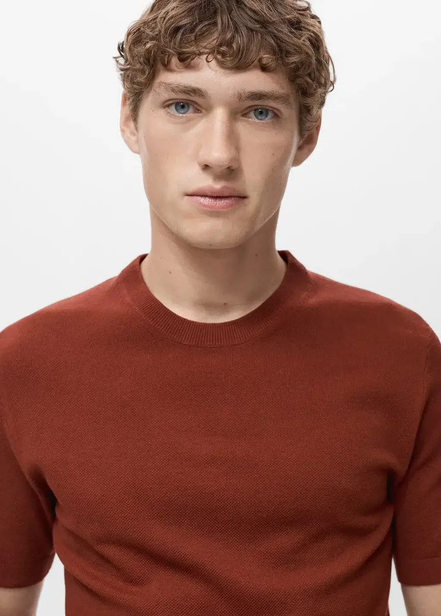 Toto tričko, které je k dispozici výhradně online v barvě khaki, má rovný střih a je vyrobeno z jemně pletené látky s příměsí bavlny a mikrostrukturou. Má kulatý výstřih, krátké rukávy a žebrované zakončení u krku, rukávů a rovný lem. Model je vysoký 190 cm a má na sobě velikost M.