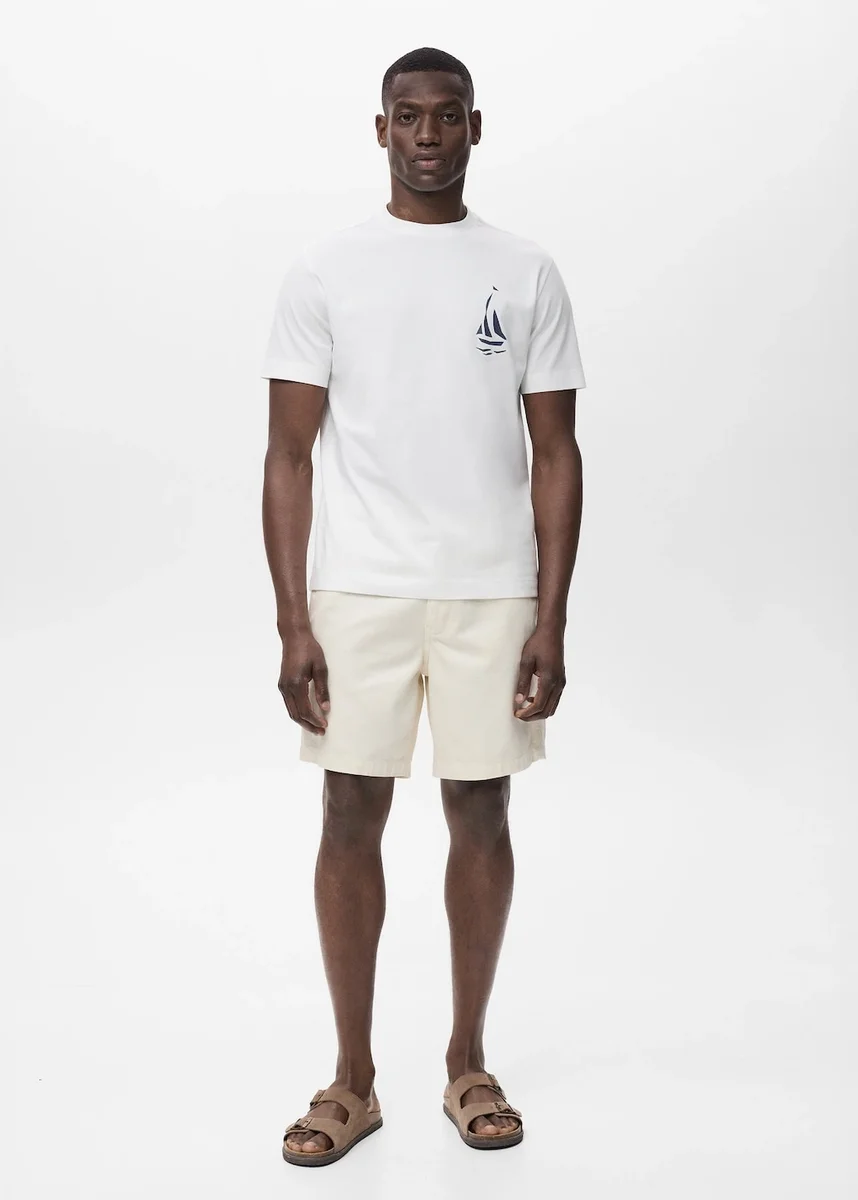 Tento oděv je vyroben ze 100% bavlny a má klasický střih s kulatým výstřihem a krátkými rukávy. Potisk s motivem lodi na hrudi mu dodává osobitý vzhled. Rovný lem dotváří celkový design. Model je vysoký 190 cm a má na sobě velikost M.