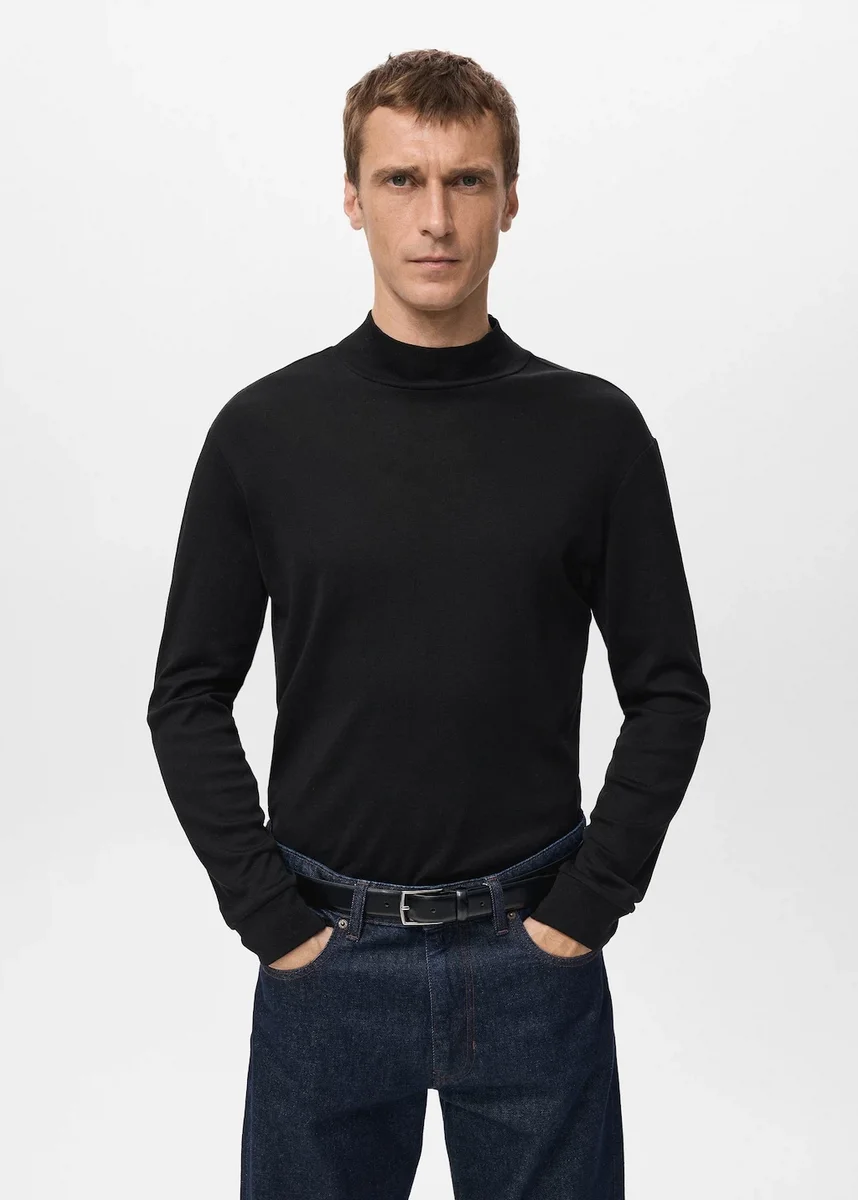 Úzký střih. 100 % bavlna. Rolákový límec. Dlouhé rukávy. Žebrované manžety a lem.