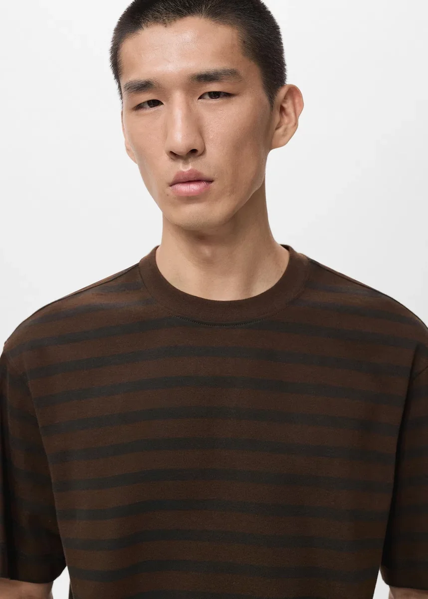Volný střih. 100% bavlna. Pruhovaný design. Kulatý výstřih. Krátké rukávy. Rovný lem.