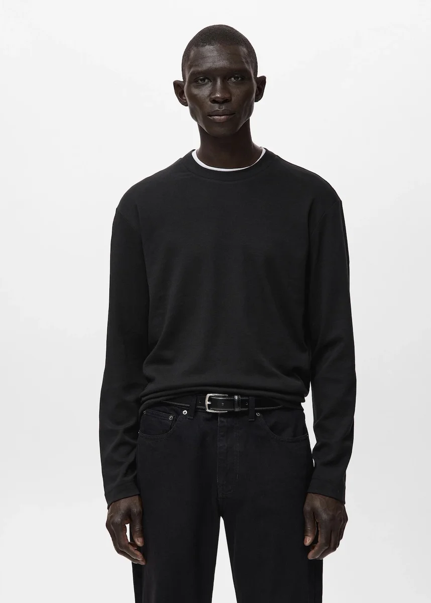 100% bavlna. Regular fit. Kulatý výstřih. Žebrovaný límec a manžety. Dlouhé rukávy. Rovný lem.