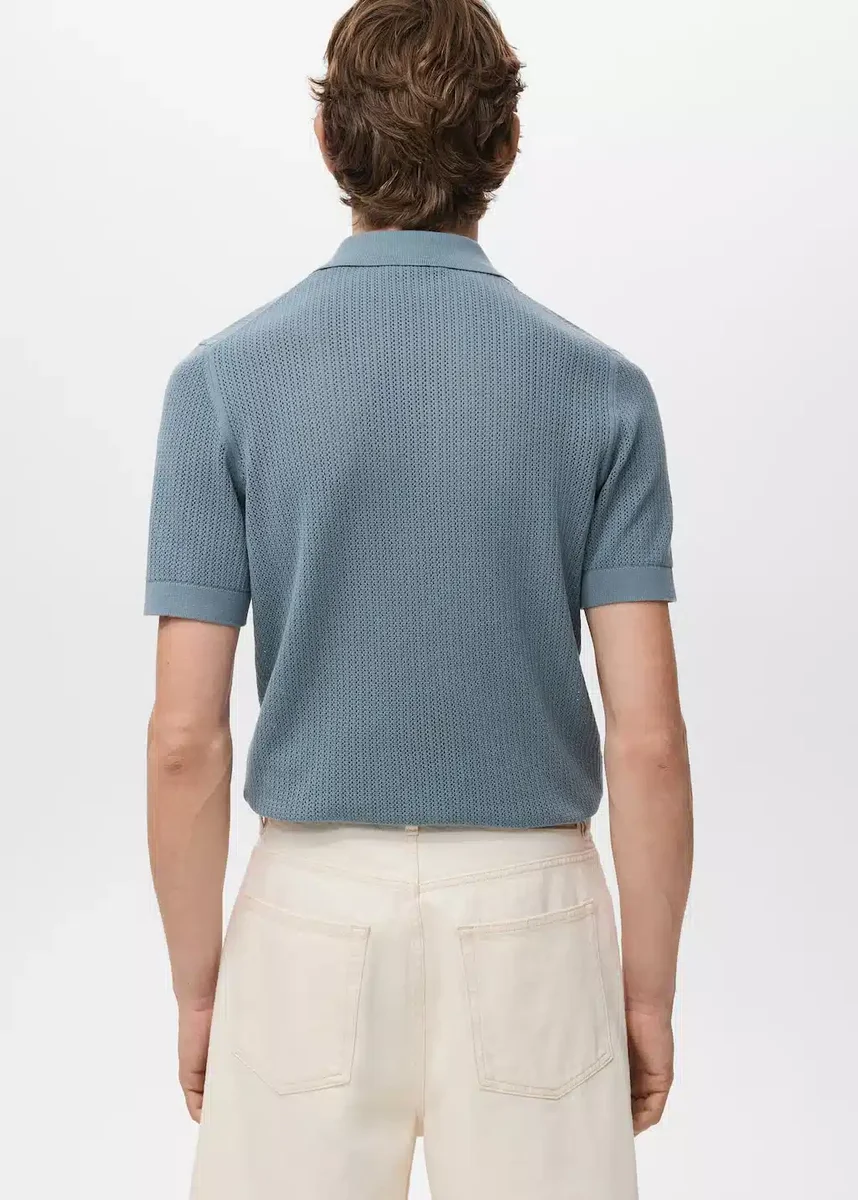 100% bavlna. Rovný střih. Jemně pletená tkanina s krajkovými akcenty. Polo límeček se zapínáním na knoflíky. Krátké rukávy. Žebrovaný límeček, rukávy a lem.