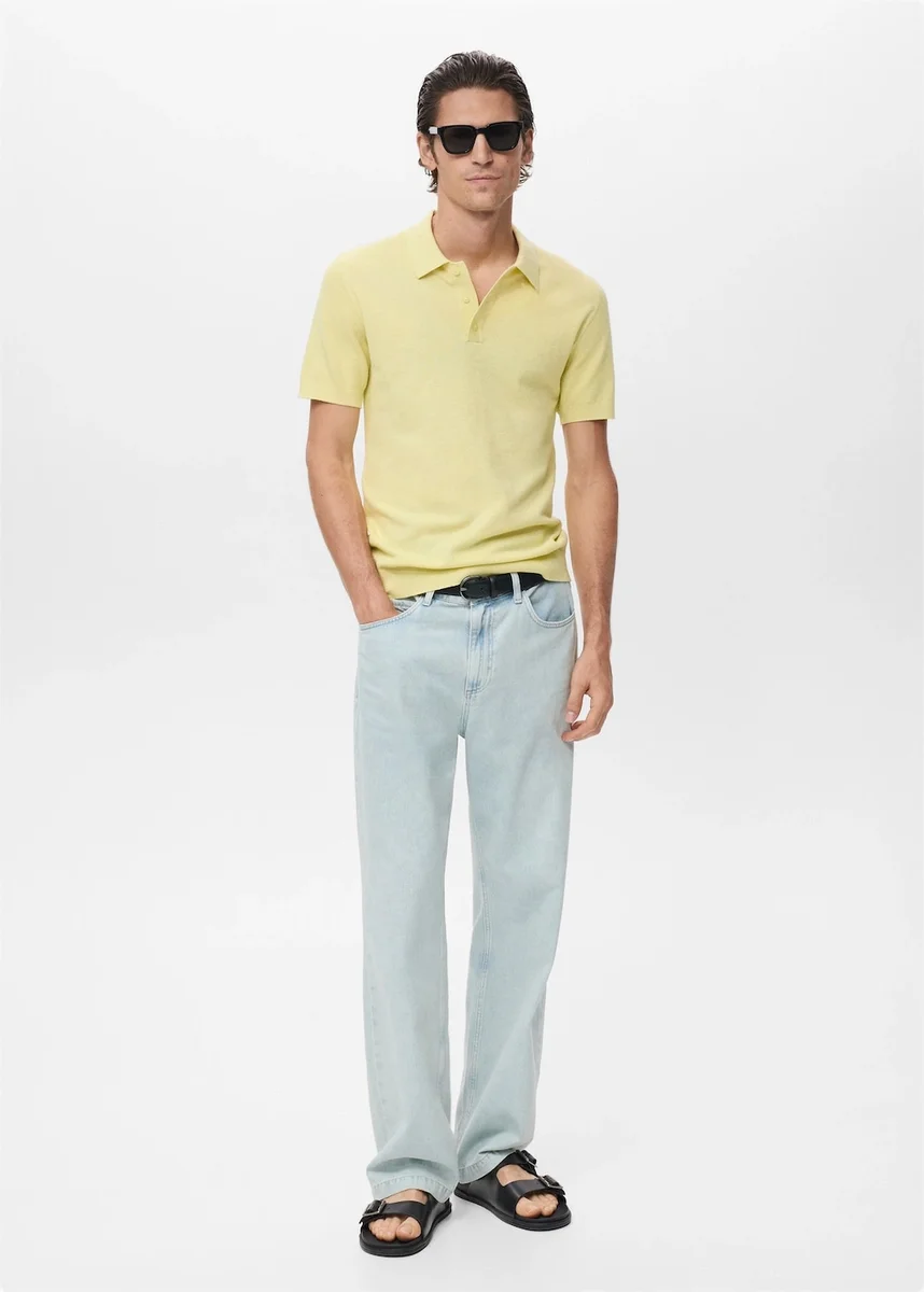 Slim fit. Bavlněná směsová tkanina. Jemně pletená tkanina s mikrostrukturou. Polo límec se zapínáním na knoflíky. Krátké rukávy. Žebrovaný lem na rukávech a spodním okraji. Rovný spodní okraj